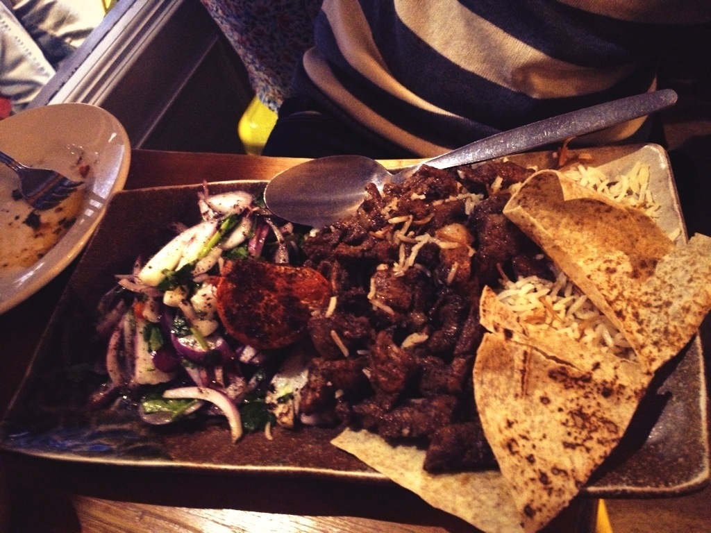 Yalla Yalla has a small menu, but we wanted to order every single item. As we were simply snacking, we ordered 4-5 of their mezze to share, including the hommos, falafel, soujoc and baba ghannouj. Everything arrived very quickly, and we attacked without hesitation. One of my companions, who has been to Israel, firmly said: ‘I allow you to bring friends here. This is a good place.’ We were showered with pita bread and an array of different flavours. The hommos made me swear off Tesco hummus for life, and the soujoc made me rethink my dislike of tomato. As we tucked in, conversation slowly desisted, which to me is the true mark of excellent food.