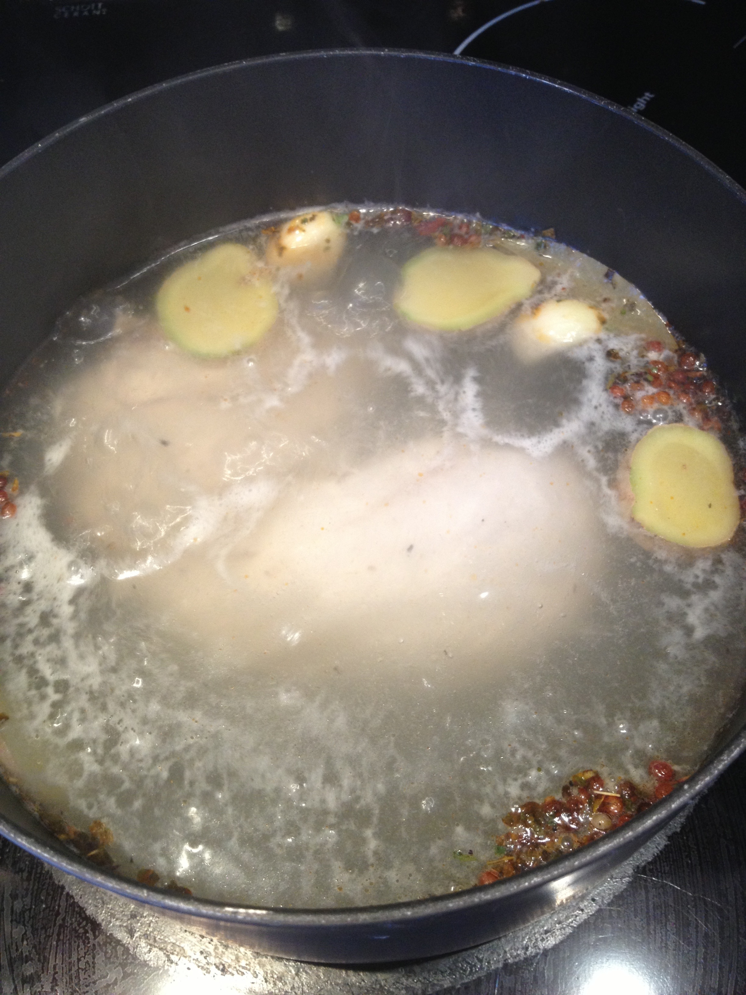 This recipe could not be easier: Just put everything except the chicken in a pot and set to boil. Once the water boils, add the chicken, turn down the heat and let simmer for about 7-8 minutes. Then turn the heat off and leave the chicken in the water. When I cooked it, I didn’t leave it for too long, but ideally it should sit for around 1 hour (at least).