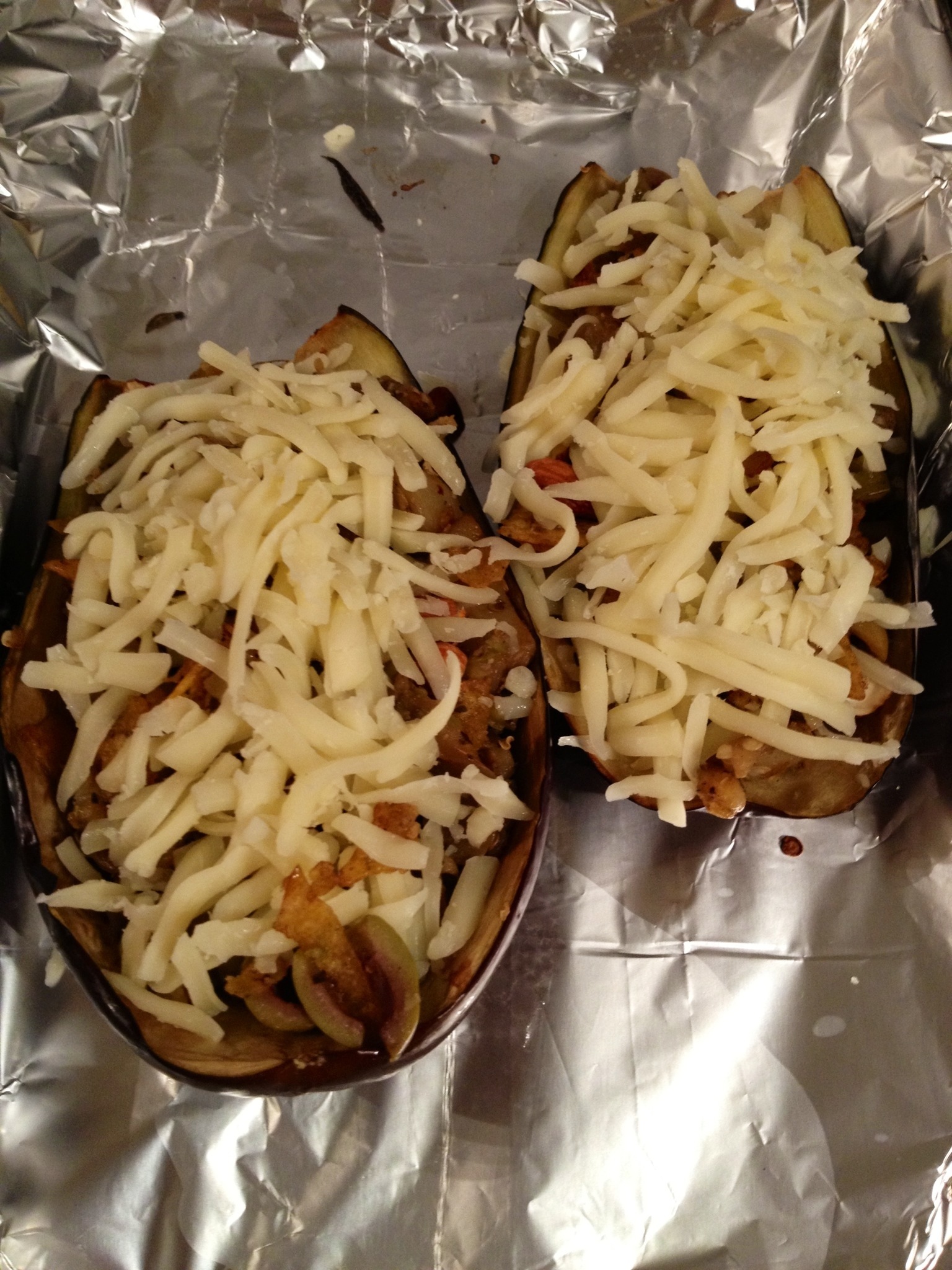 Take the aubergine halves out of the oven and fill with the mixture. Top with mozzarella cheese and bake for another 2-3 minutes, until the cheese turns golden. Take it out, serve and devour!