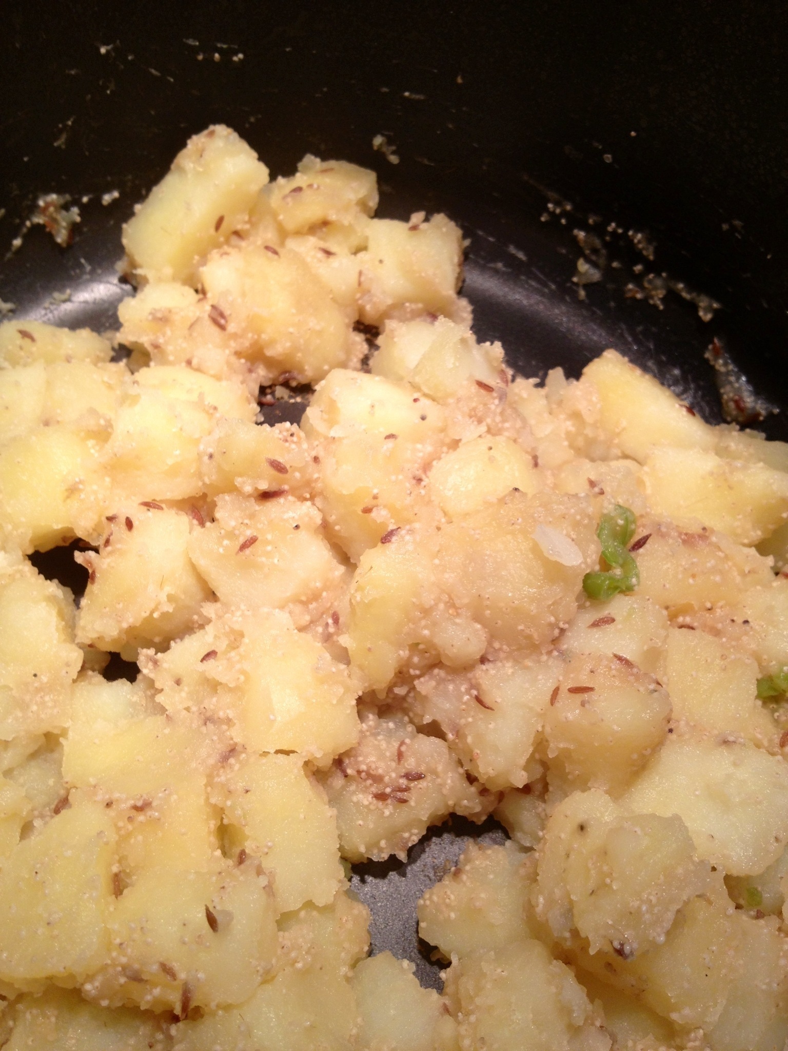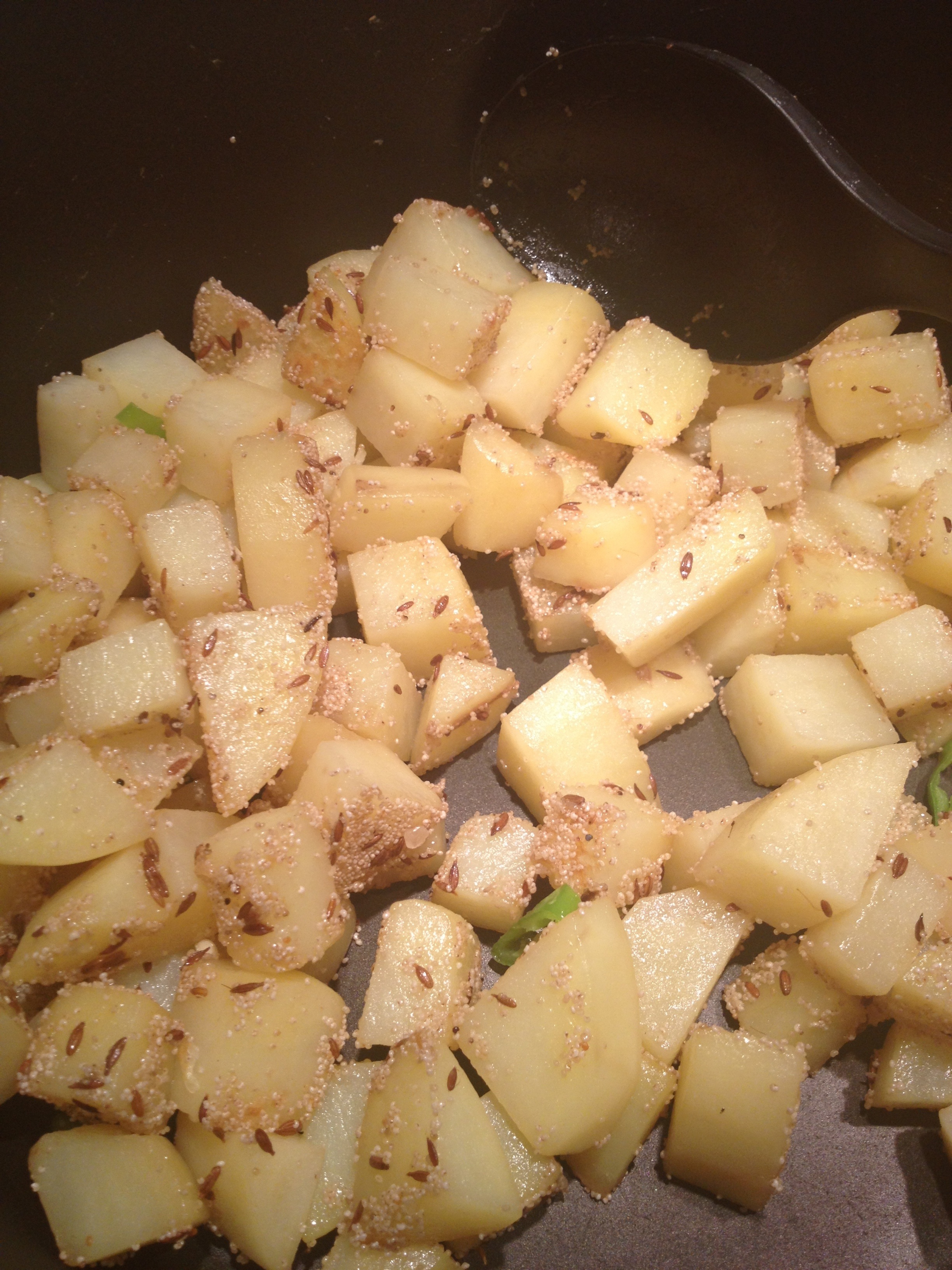 Heat the oil in a pan and add the cumin seeds. Fry for about 2 minutes, or until they start splattering in your face (this is what happened to me). Then add the potatoes and cook for 5 minutes on medium heat, stirring frequently to avoid burning. Be patient, as this is a key part of the process. Add 1 tsp salt here as well.