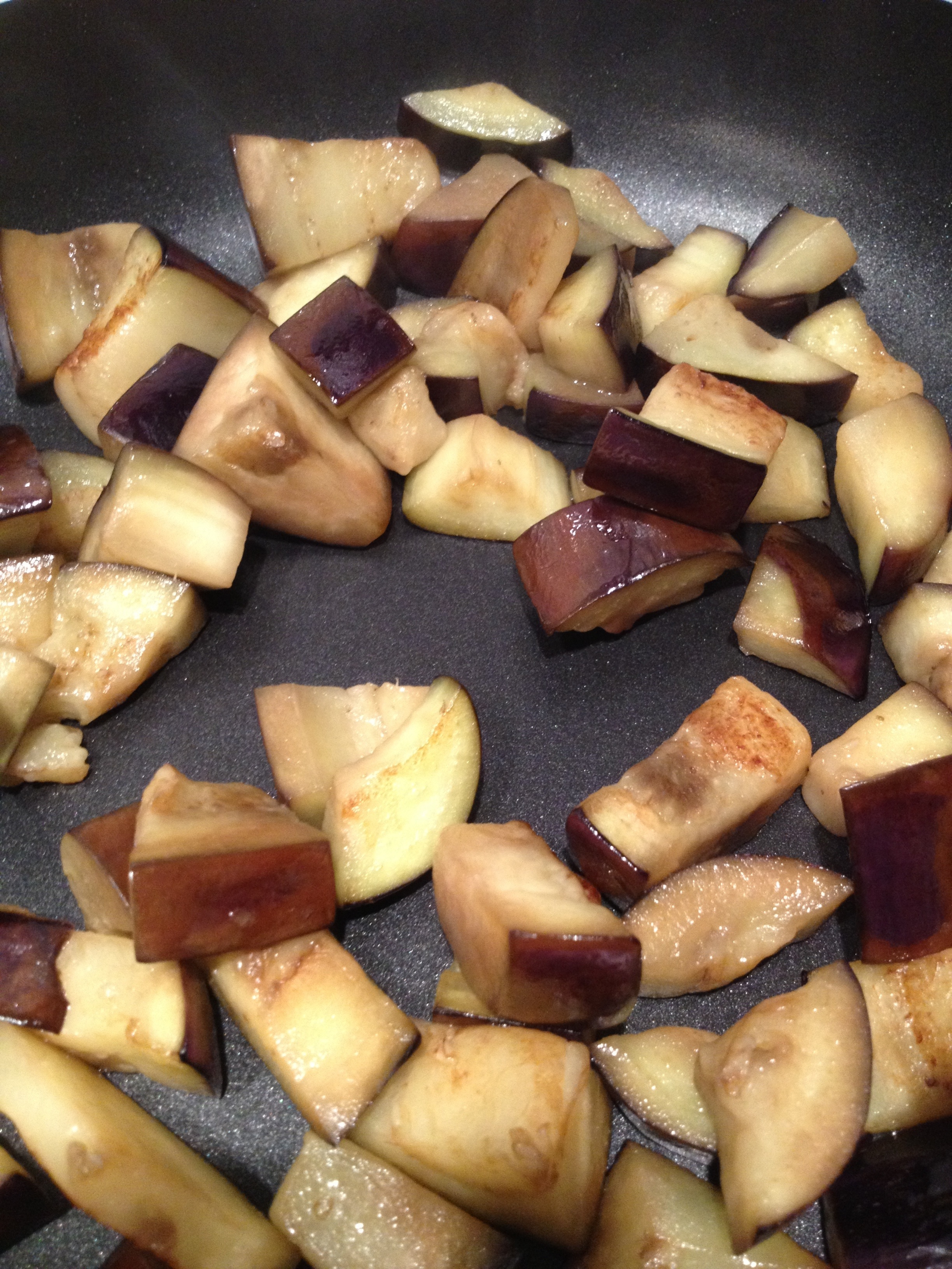 Heat the vegetable oil until it is hot and fry the aubergine for 5-7 minutes until it is soft. Make sure you wait until the oil is hot, else the aubergine will soak up more oil than necessary! Keep stirring it as it cooks, and then it will brown nicely on all sides. Keep aside. It should look like this: