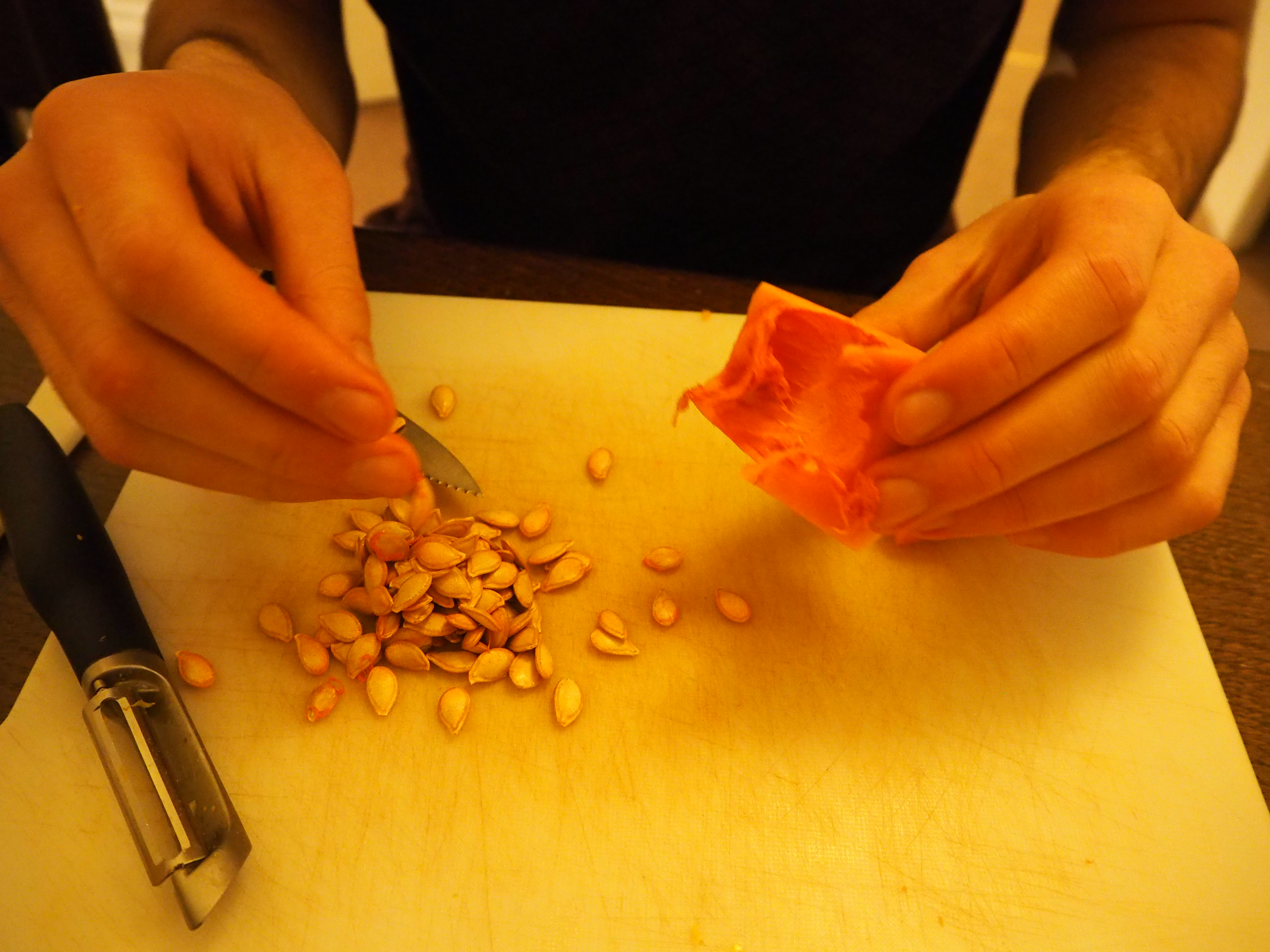 3) If using, spread the squash seeds onto a baking tray, sprinkle with olive oil and salt, and roast for 5-10 minutes. Keep aside for garnishing.