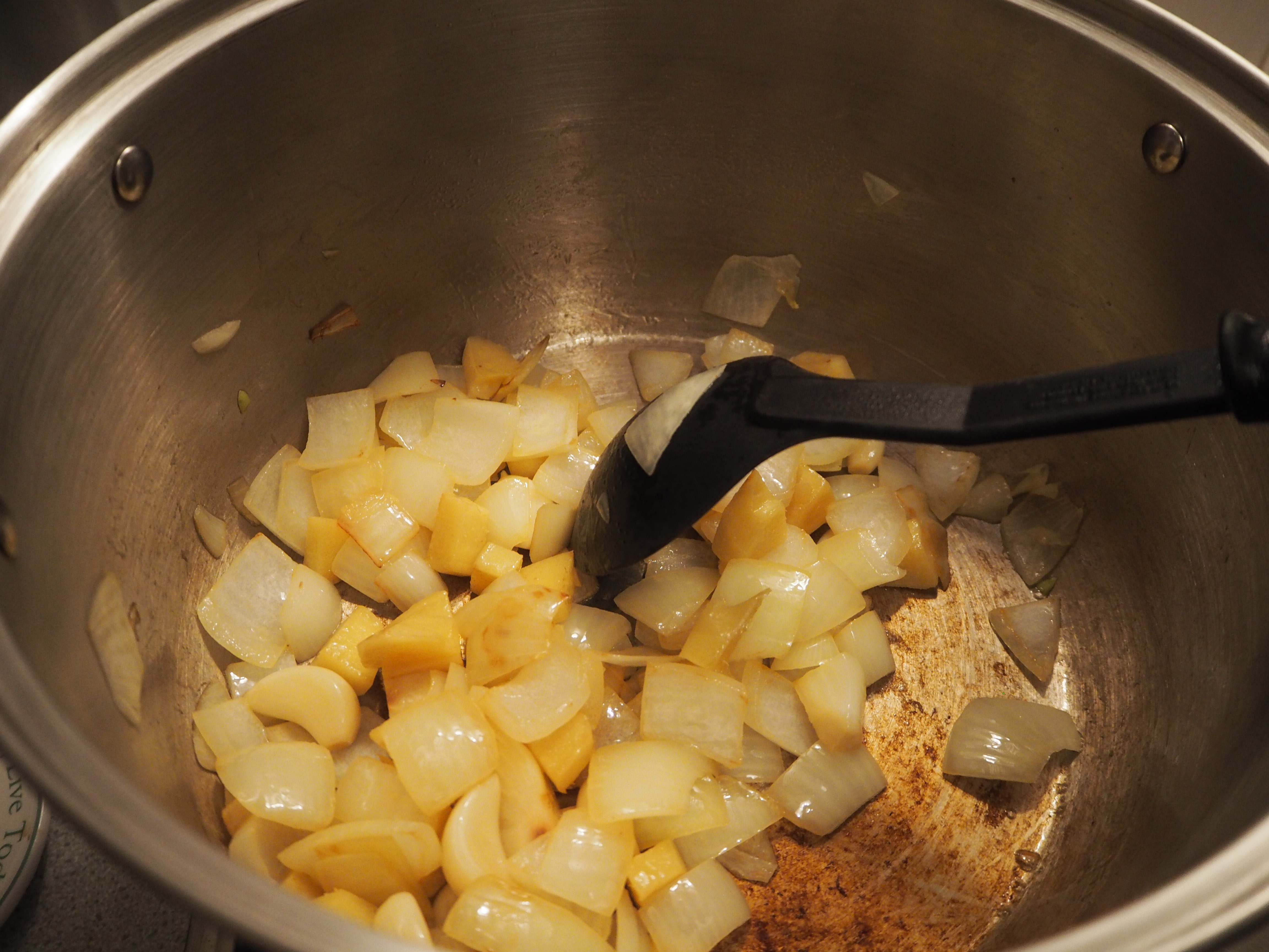 2) Melt the butter in a large, deep saucepan and fry the onion, garlic and ginger for a few minutes. Then add the potato, carrots and squash.