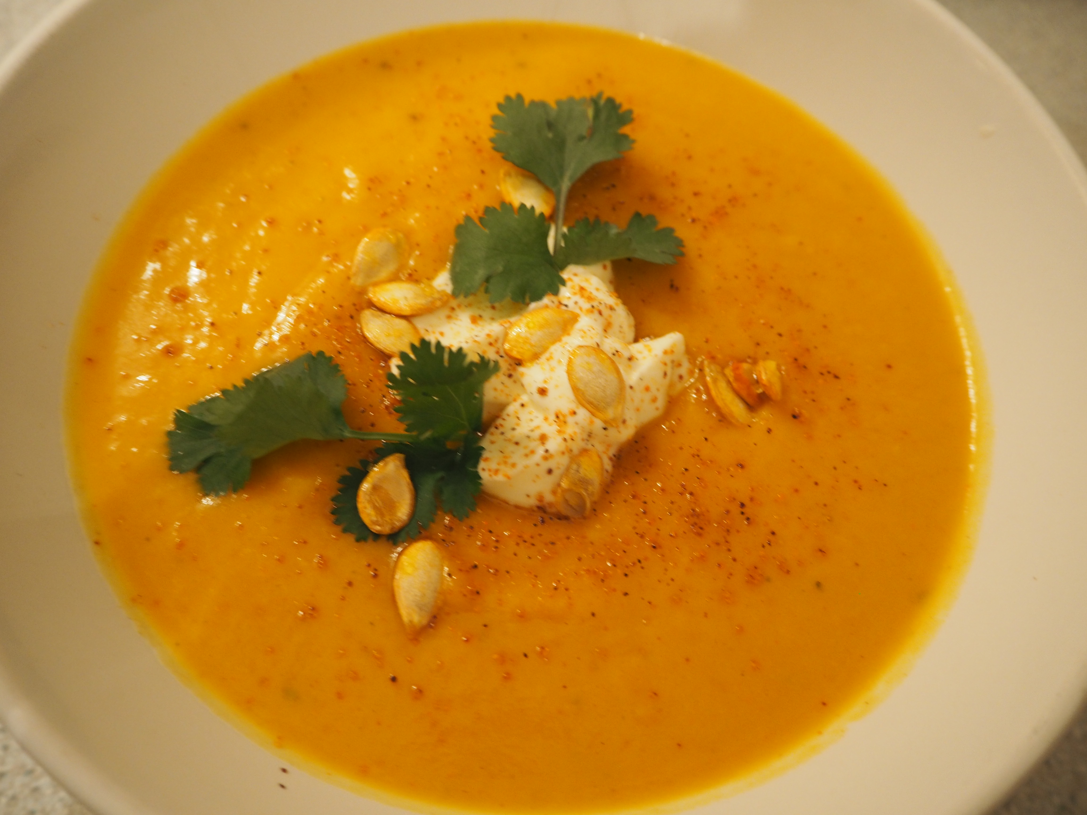 7) Serve with a bit of paprika, fresh coriander and dollop of sour cream on top, plus some toasted squash seeds and crusty bread