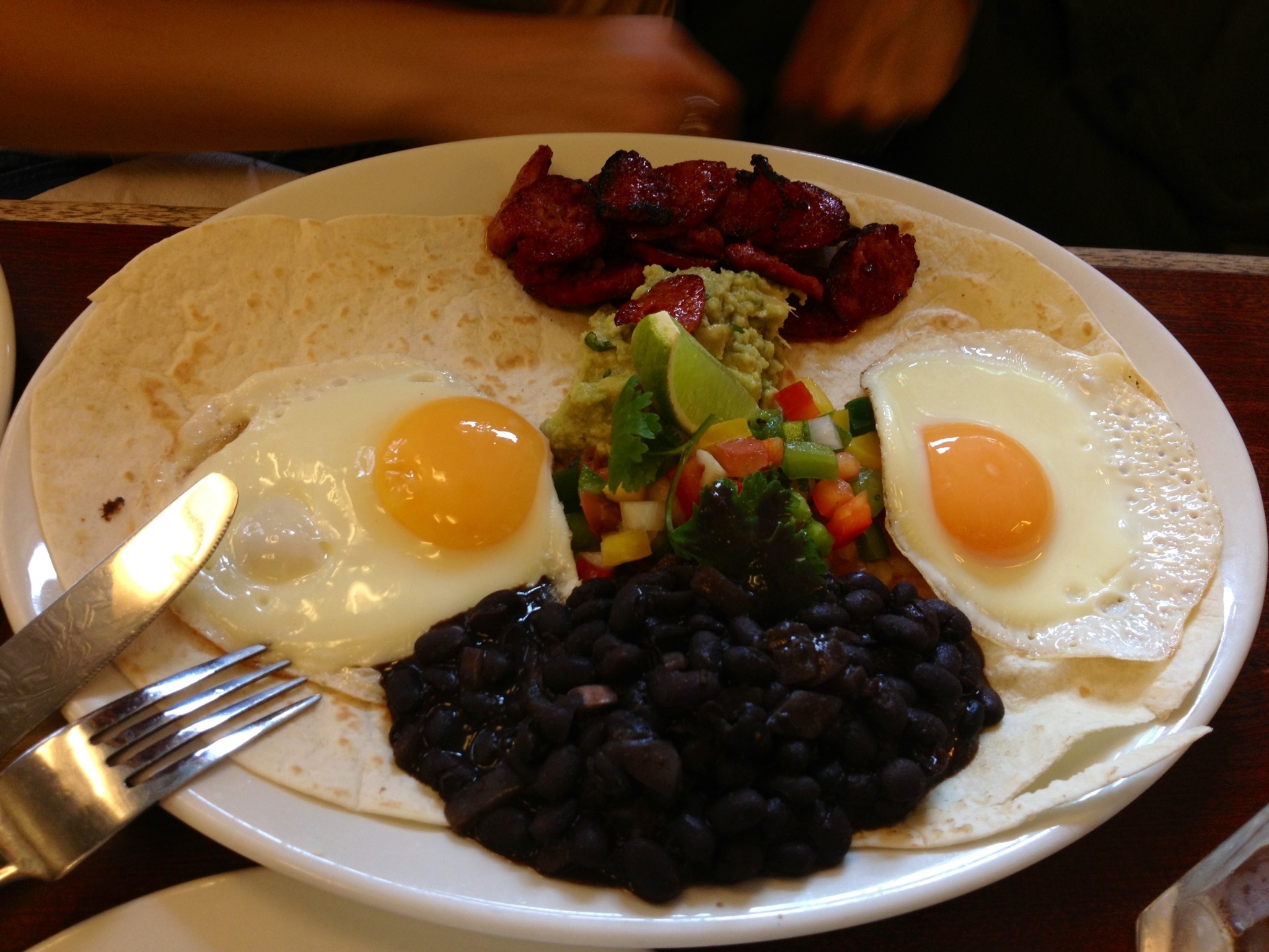The food arrived pretty quickly, and the service was very friendly (so it really felt American!). The Eggs Royale were wonderful – neither under nor overdone with the perfect ratio of salmon, to muffin, to eggs, to hollandaise sauce. The fries, though slightly overpriced, were crispy and delicious, just like the bacon. And the huevos rancheros were, in my flatmate’s words, ‘zingy’ (that’s a compliment).