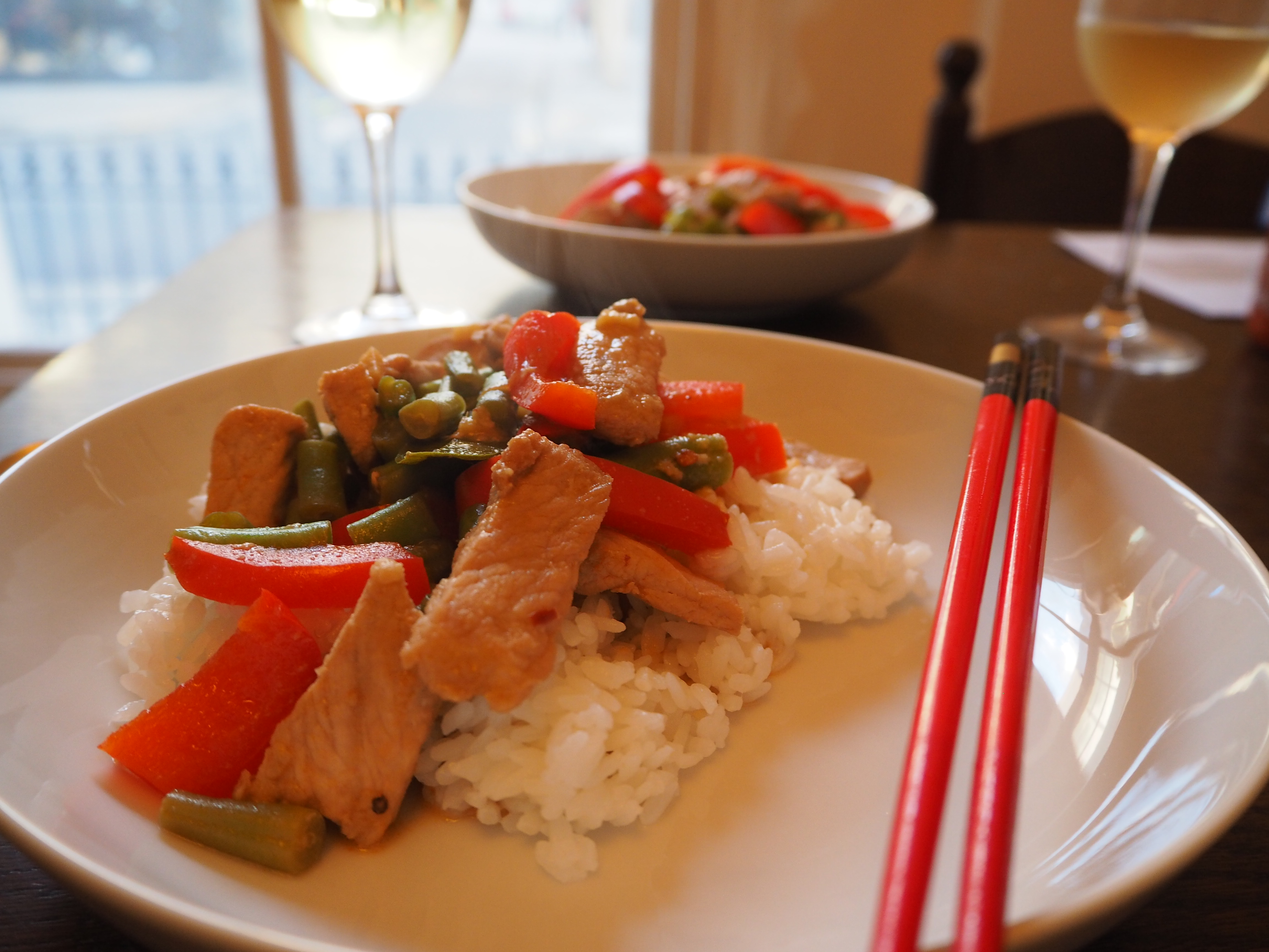This is a very simple stir-fry. The only thing that takes time is chopping the beans and pepper, but even that is very quick. It tastes wonderfully tangy due to the ginger and lime, and the sauce is slightly thick and goes perfectly with sticky rice. It’s also nice and colourful, which is the mark of a healthy, balanced meal (or at least that’s what my father always used to say!).