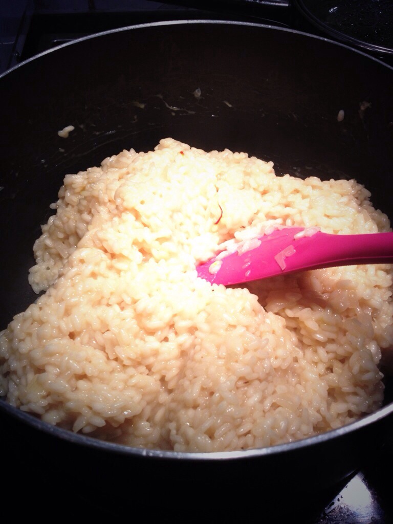 Turn the heat to medium and ladle in some saffron-y chicken stock from the saucepan. Stir until all the liquid is absorbed. Add some more stock. Stir until absorbed. Add some more. Stir. Continue this process for around 20-25 minutes until the rice is almost done (so still with a bit of bite). Don’t be tempted to just pour in all the stock and wait for it to be absorbed, this slow cooking process is key to a good risotto!