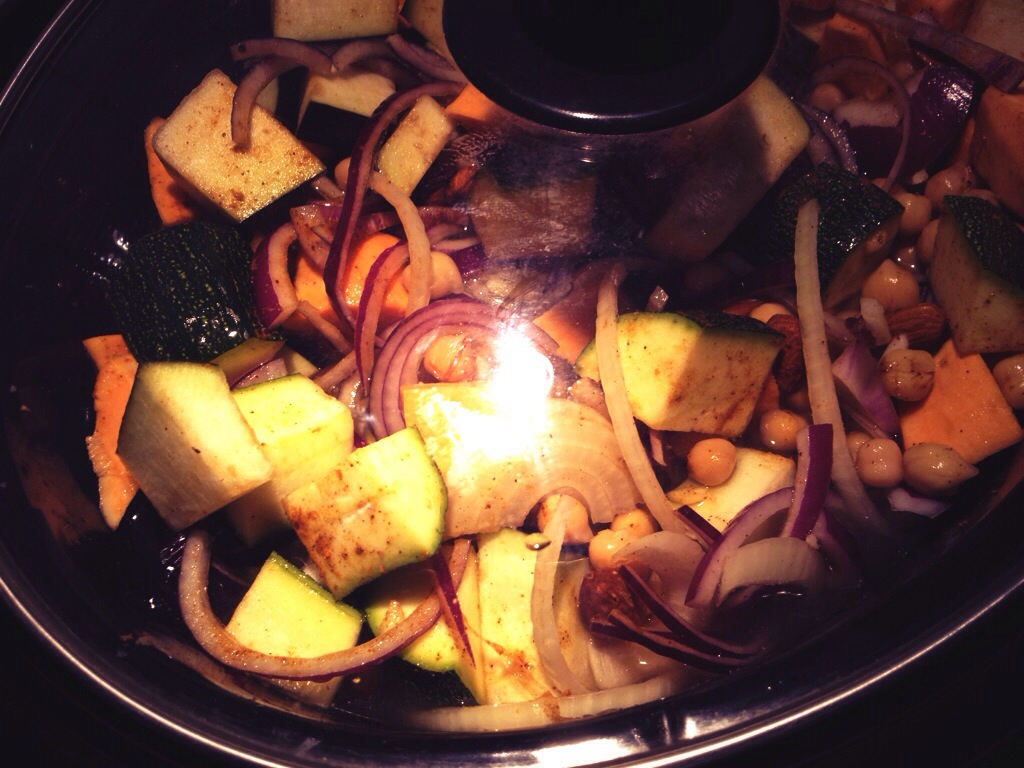 Prepare all the vegetables and put in the slow cooker along with the vegetable stock, the Ras El Hanout, salt and lemon juice. Cook on high heat for about 4 hours, or until the potatoes are done.