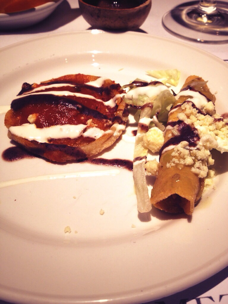 Then it was finally time for the hotly anticipated mezcal, more specifically the Ilegal Mezcal Joven Blanco. We drank it from a cup made of an imported fruit shell from a local Mexican village, which was fun and certainly a different way of drinking! This mezcal was quite smokey and a bit too strong for my feeble palate… With this, we received chicken flautas (deep-fried) each along with sopes, made of corn. As before, I was slightly disappointed with the food, as the chicken inside the casing was a bit dry.