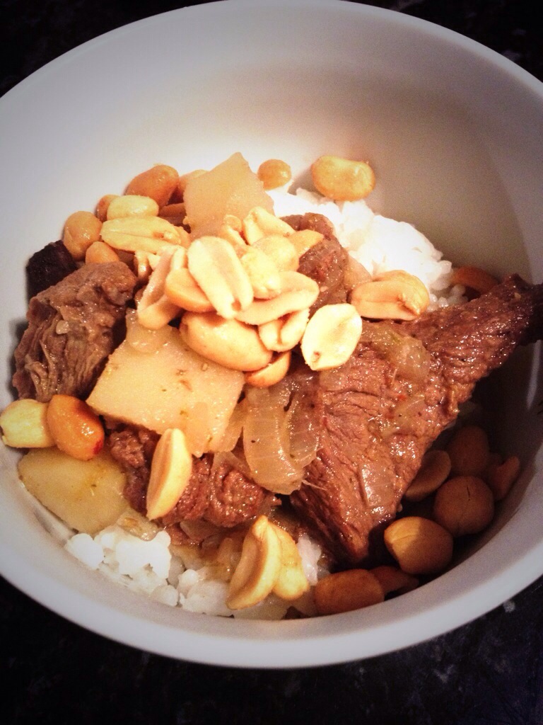 In the same deep frying pan, heat another 2 tbsp vegetable oil and brown the beef with salt and pepper (4-5 minutes). Remove the beef and set aside. Then fry the onions for a few minutes until slightly brown before adding the blended curry paste. Fry for 2-3 minutes on high heat and then add the coconut milk and beef stock. Let it reduce for around 10 minutes and then add the beef back in, along with the potatoes, fish sauce, brown sugar, tamarind paste, bay leaves and cinnamon bark. Lower the heat, cover the pot and let it simmer for around 2.5-3 hours. Serve with rice or as a soup and garnish with salted peanuts!