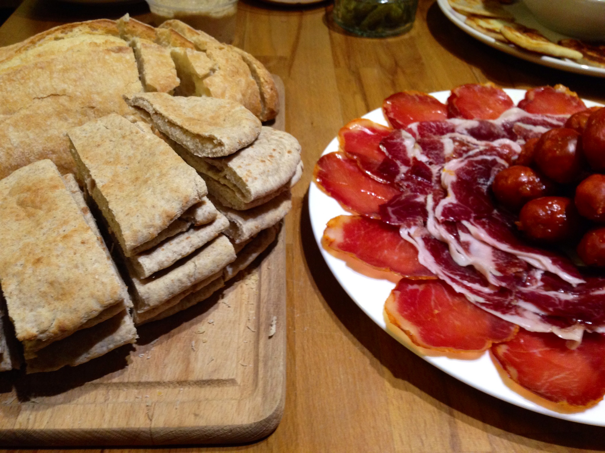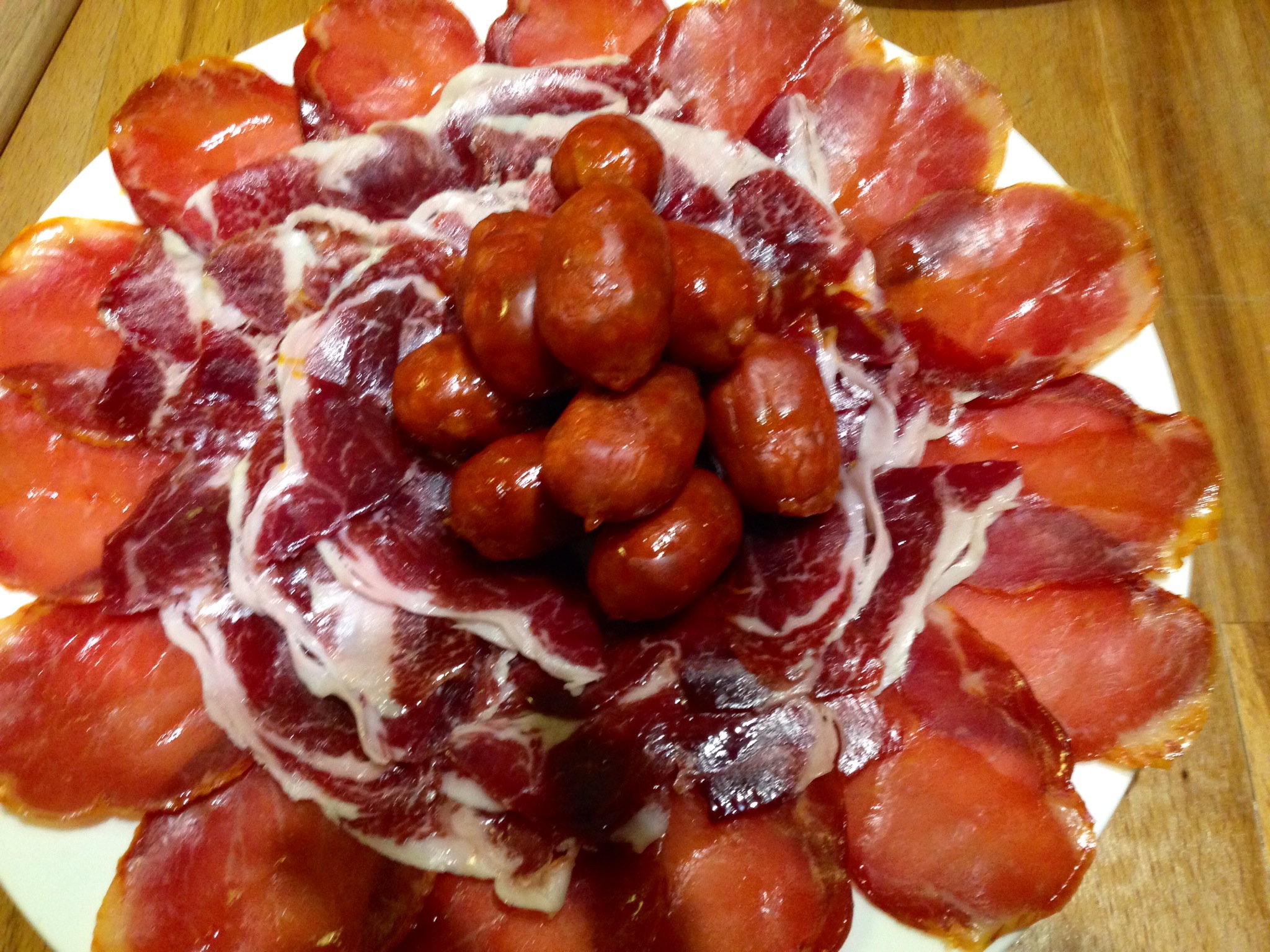 - Jamon iberico (cured Spanish ham), lomo iberico (Spanish cured pork loin) and chorizo balls heated in the oven (bought at Waitrose)