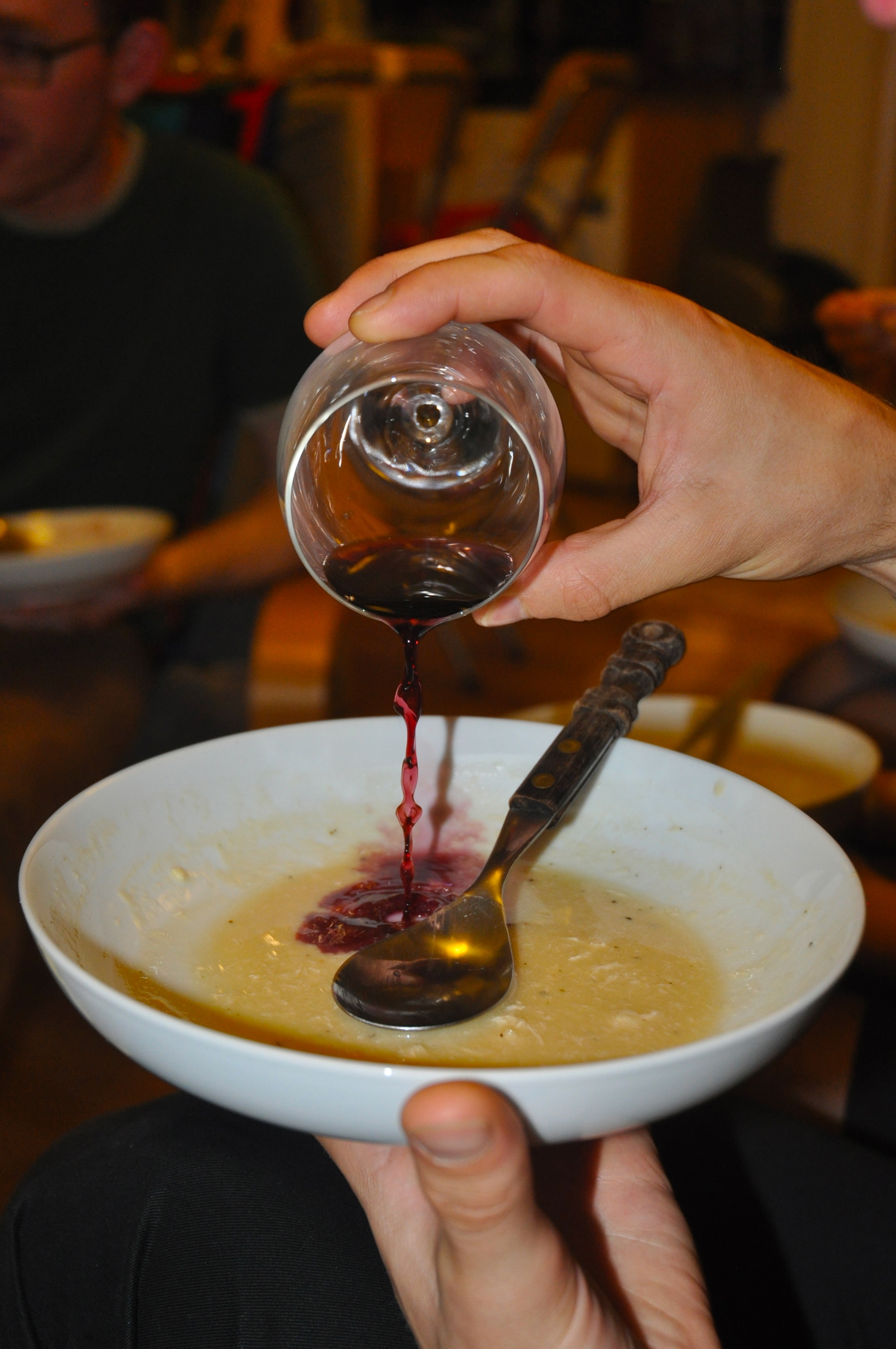 When the bowl is nearly empty, pour in a bit of wine and drink the mixture.