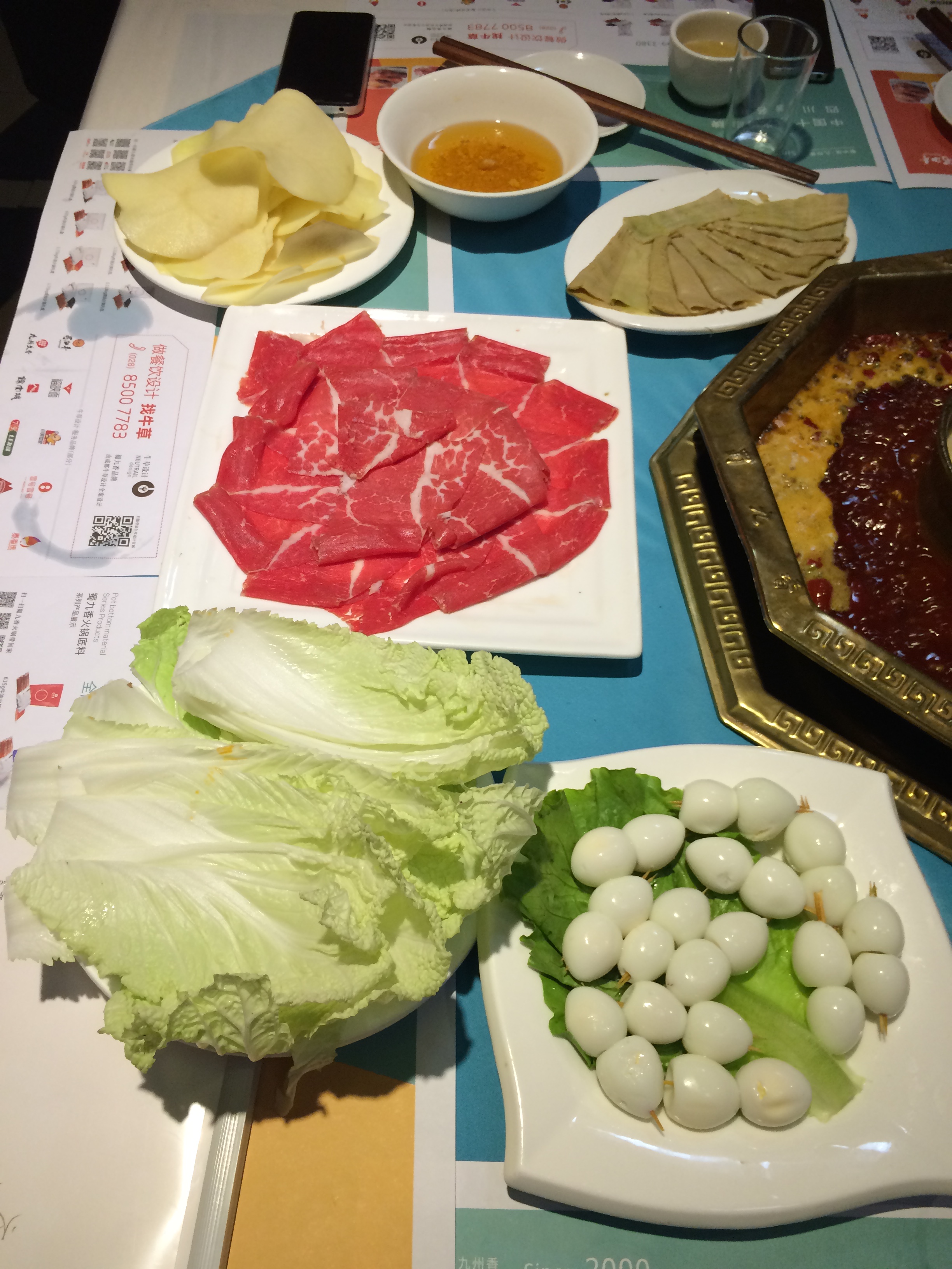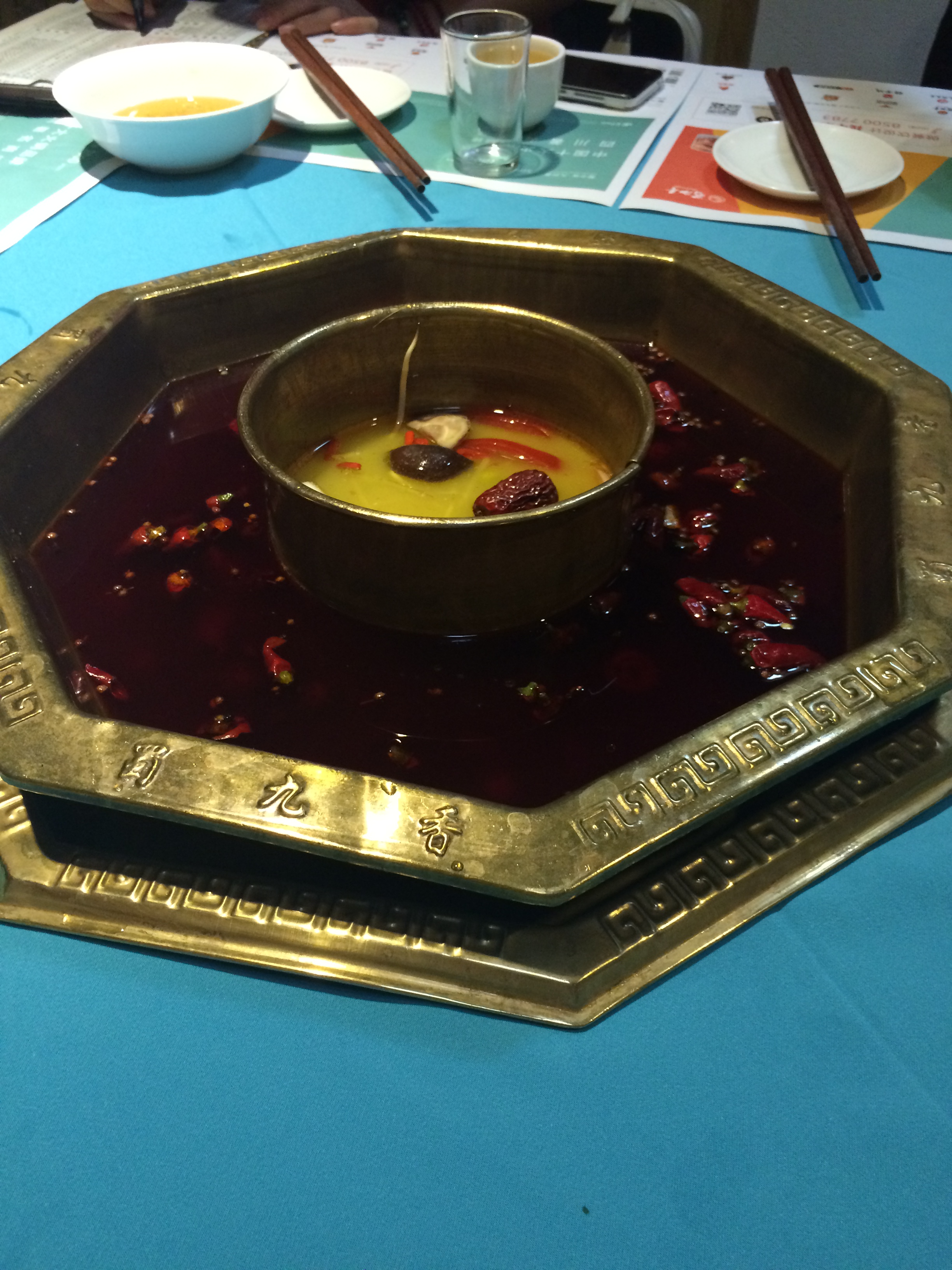 There are two burners in the middle of the tables which were soon filled with chilli oil and mild chicken soup in the middle for the faint hearted.