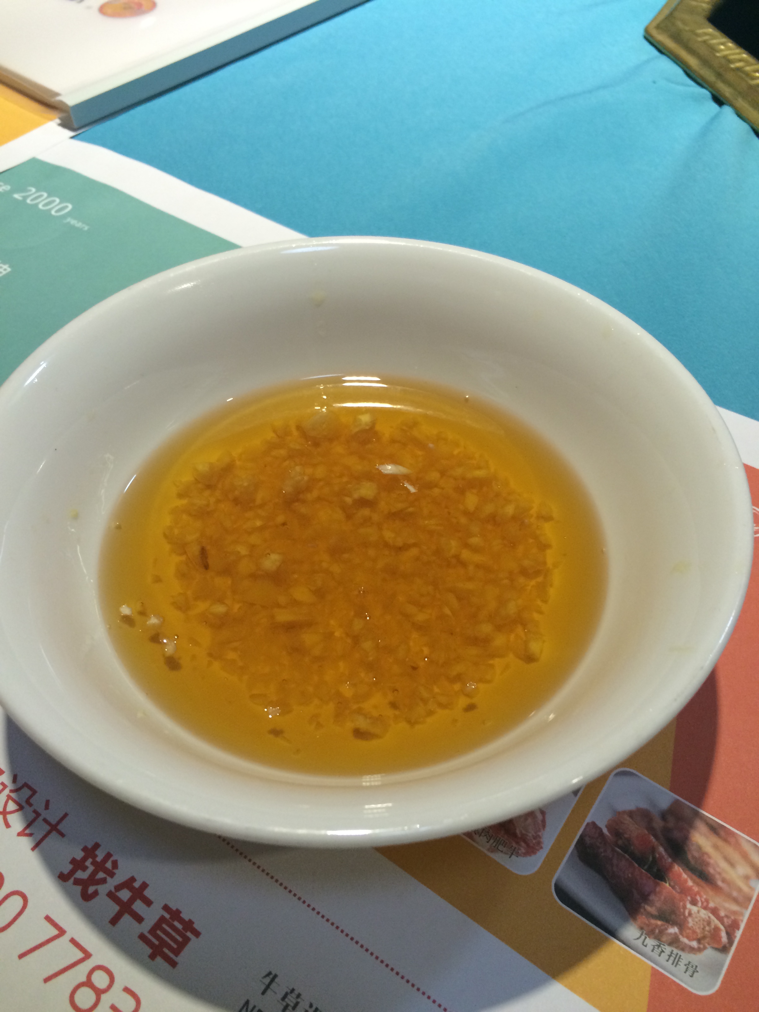 Soon the oil and soup started to bubble. We also had a bowl of sesame oil with ginger in it to dip the cooked meat and veggies. We could have added soya, spring onions, peanuts, chilli sauce and what have you to the oil, but that was not offered.