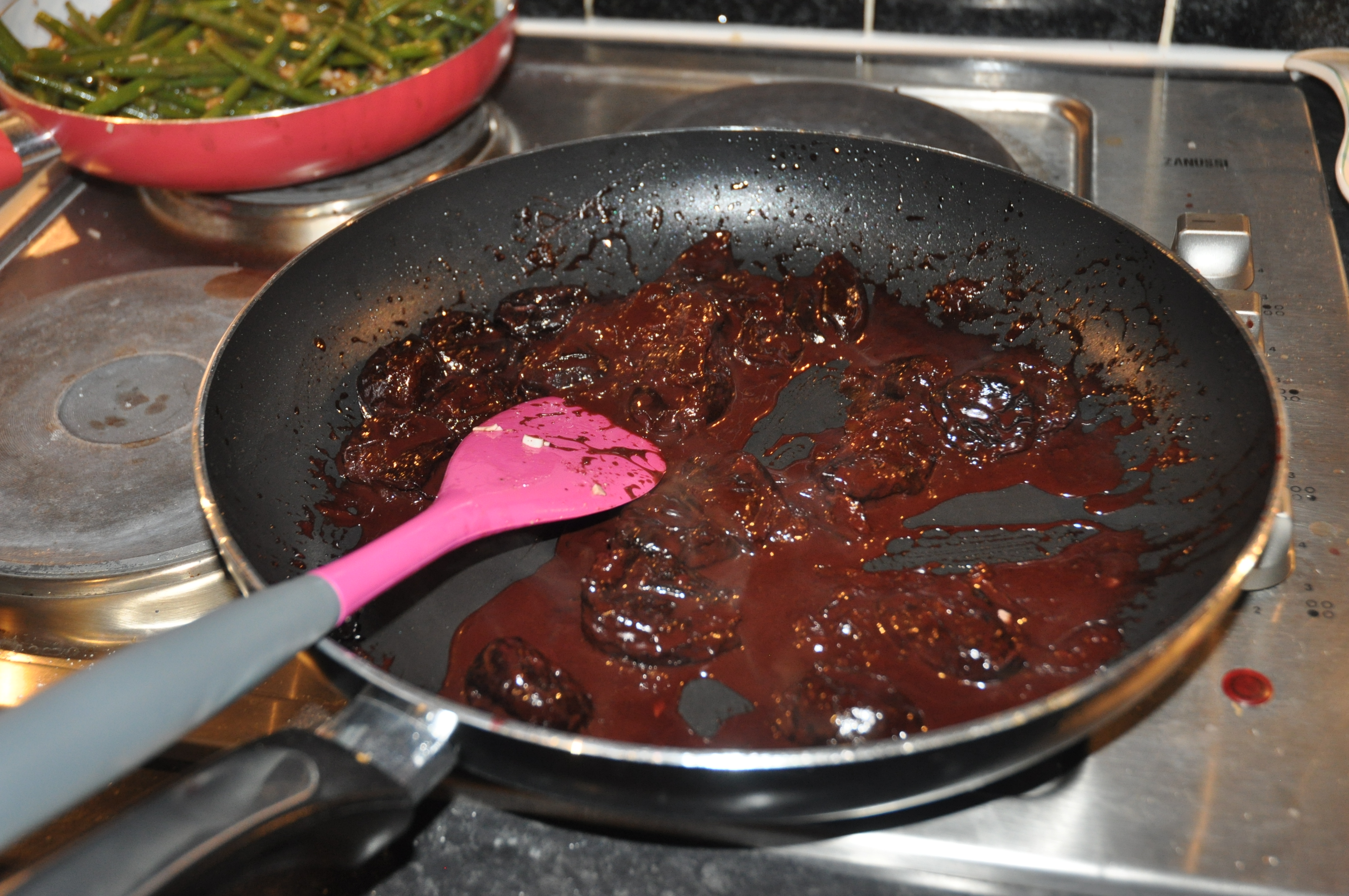 Put the sauce back in the pan and bring to a simmer. Add the grated chocolate and let simmer for 2-3 minutes. Pass the sauce through a fine sieve, pour it back into the pan and add the drained prunes. Simmer until the prunes are hot, and season the sauce with salt and pepper to taste (we actually had to add more wine at the end as the prunes were sucking up all the juice).