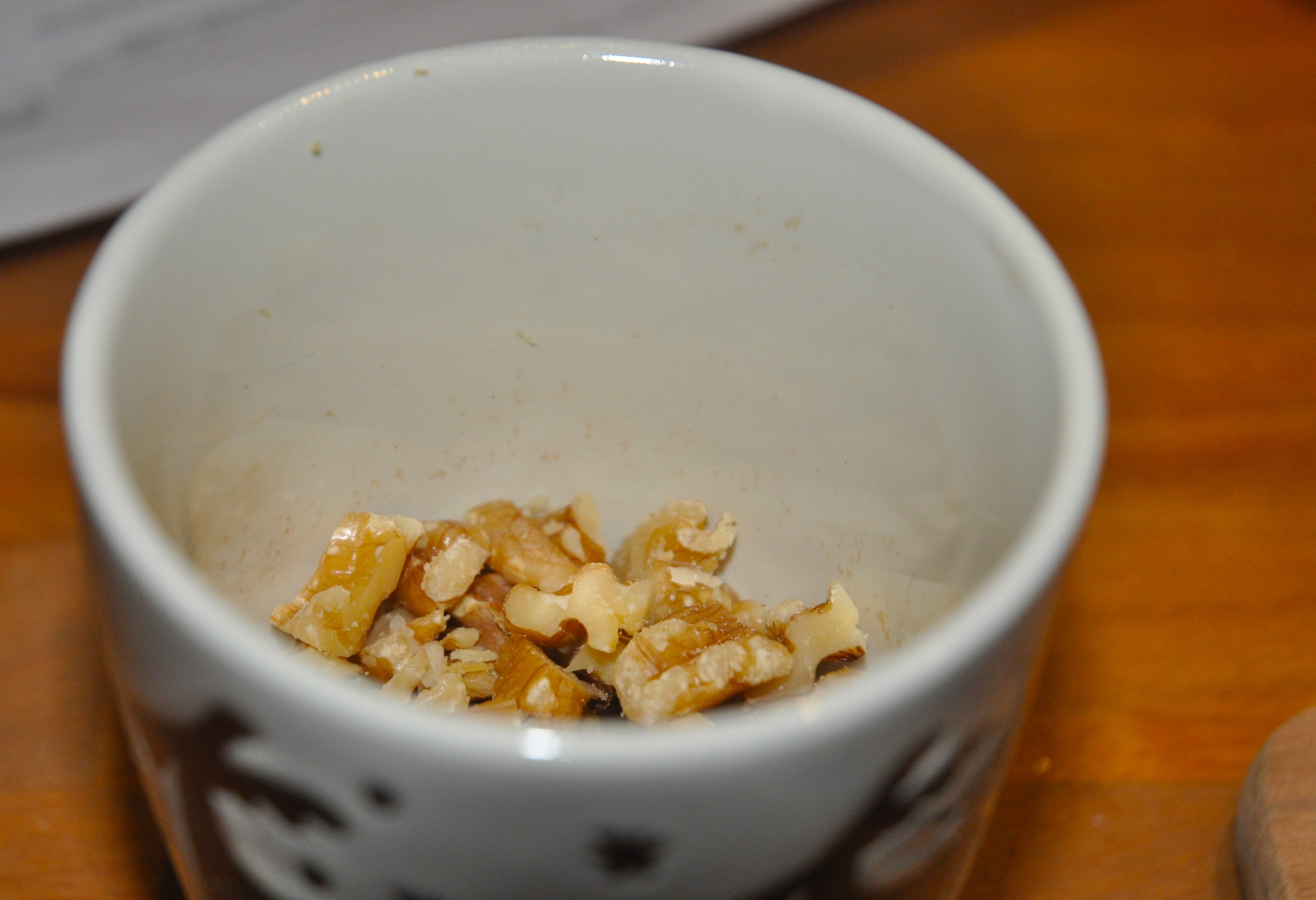 Toast the walnuts by heating a non-stick pan on high heat (no oil or butter). Add the walnut pieces and stir often until they emit a wonderful, toasty smell. Make sure they don’t burn! Remove and keep aside.