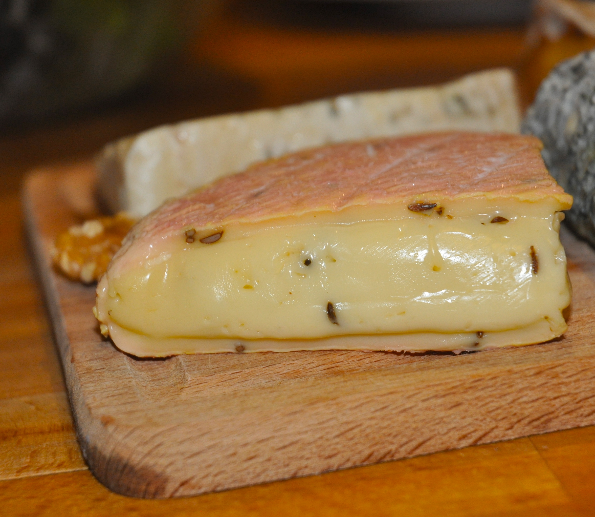 5. Munster (AOC): Now things start to get interesting. Munster, a speciality of the Alsace region, is a bit of a Jekyll and Hyde. This soft cow cheese has a washed rind, meaning that during its maturation it’s periodically bathed in brine. This encourages certain types of mould growth that develop into the cheese’s distinctive orangey-red rind. But this rind is not just strikingly coloured; it stinks. It honks so badly. When I lived in France I once bought one of these from a farm in the Vosges mountains and took it on a hot, three hour train journey home with me. Big, smelly mistake. We quadruple wrapped this cheese to make sure that its odour didn’t seep into the delicate macarons. But the good news is that if you can get the cheese past your nose and into your mouth, the struggle will be rewarded. Nicolas told us that in Alsace, this cheese is typically paired with caraway seeds (confusingly called ‘cumin’ in Alsace). La Cave à Fromage got in touch with the producer and asked whether those fragrant little seeds could be incorporated into the cheese itself. Et voilà! This cheese converted even the non-believers. The caraway seeds lent the cheese a lightly fragrant flavour that reminded me of marrowfat peas. Nobody else agreed with this. They had flavours of herbs and aniseed, though. This isn’t the sort of cheese that you’d keep in the fridge to eat regularly, but as part of a cheeseboard at a soirée, it makes a statement. Munster’s usual wine partner is an Alsatian Gewurztraminer, but we thought it went not too shabbily with that other Alsatian classic, the Riesling, whose balance of sweetness and acidity refreshed after the rich fattiness of the cheese. If you prefer a red wine, I think a full-bodied red with a bit of spice to it like a French Syrah (generally known as Shiraz if it’s from anywhere else in the world) or a Malbec.