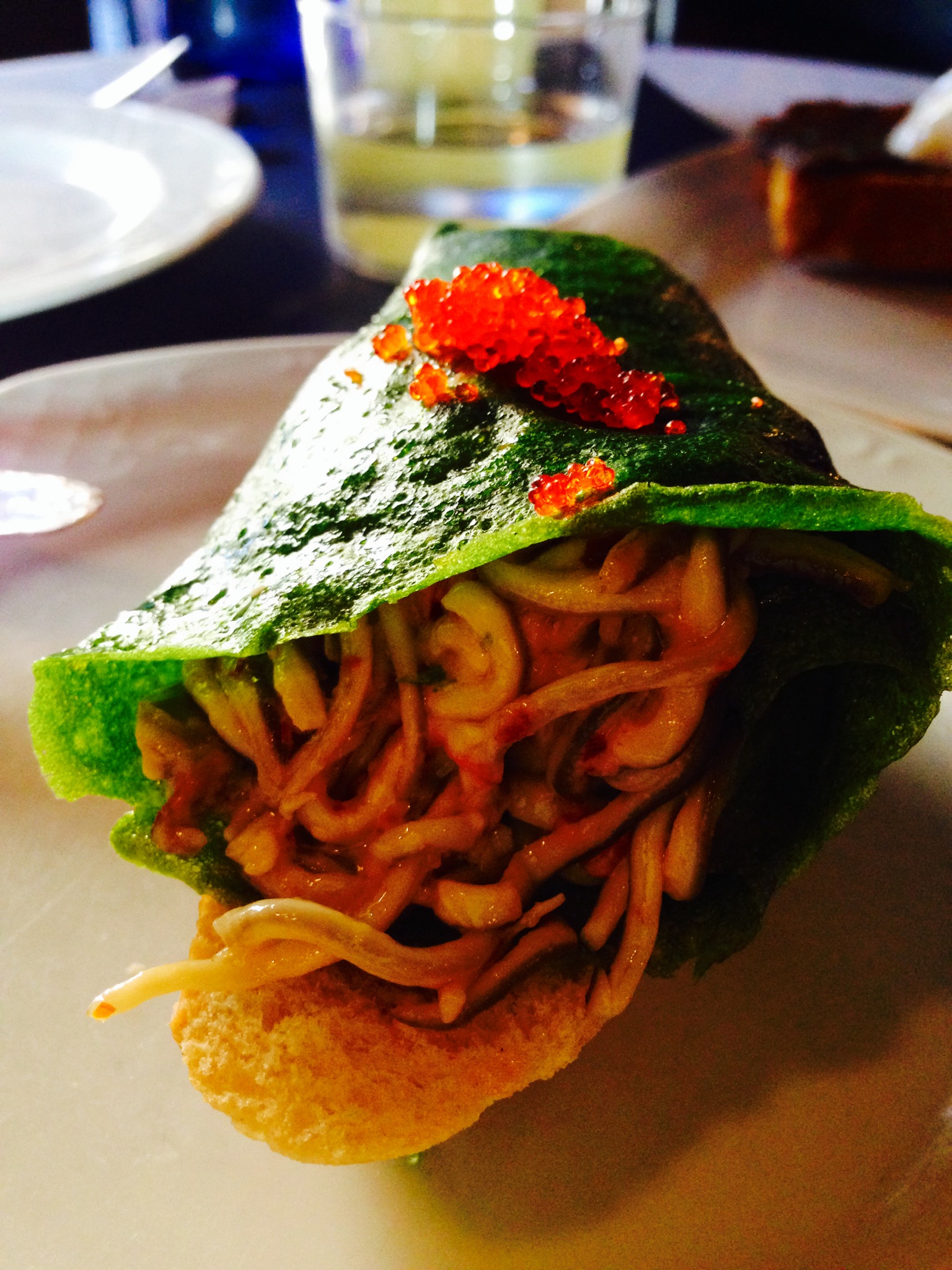 We then cast our eye over to the bar, where the pintxos stood ready. Our sisterly connection meant we were in complete agreement about what else we wanted to eat: el huevo increible (yup, that’s the ‘incredible egg’) with truffles, spinach crepe with baby eels (don’t knock it til you’ve tried it) and after slight deliberation, the mushroom and truffle croquetas. These were a mistake, as the truffle taste was barely noticeable and we were actually already full.
