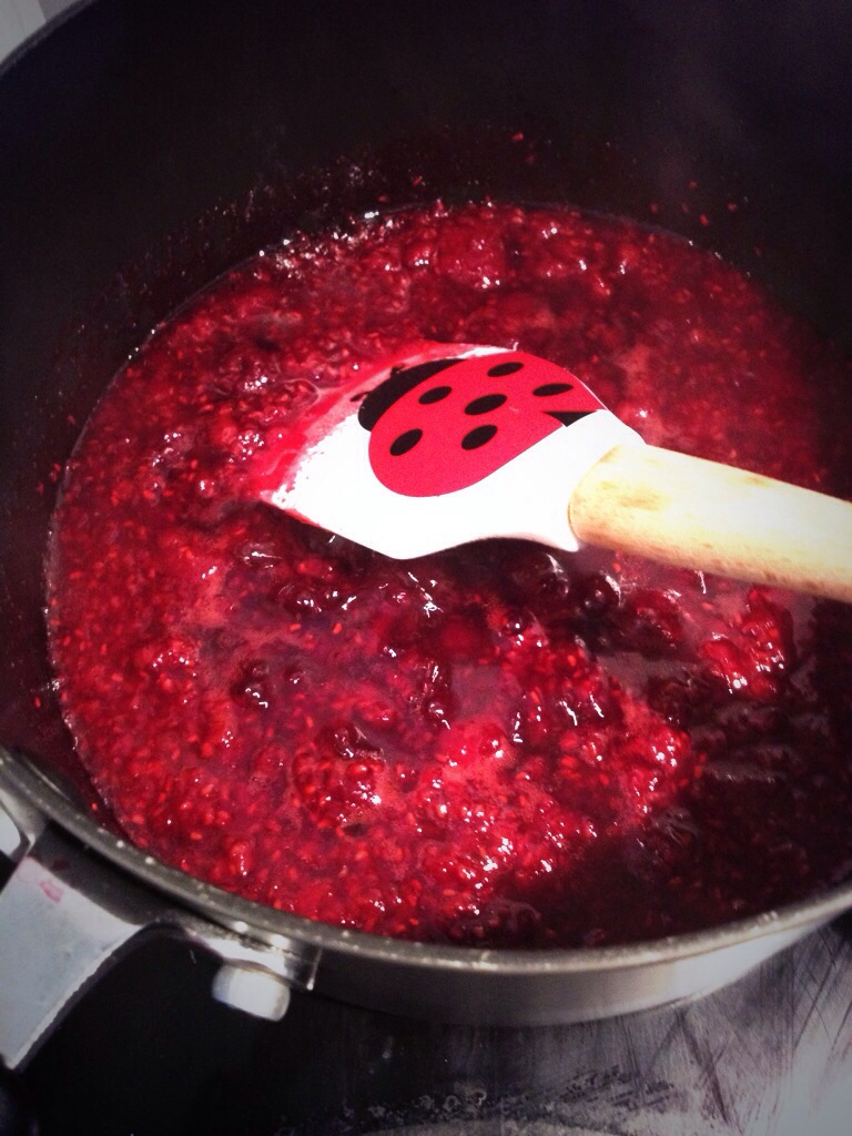 Place all ingredients into a small saucepan and cook at low heat for around 20 minutes. The amount of sugar is variable depending on the tartness of the raspberries. You should add enough not to make them sour, but keep a sharp edge to them. The result should be jammy, but not jam! Keep aside to cool.