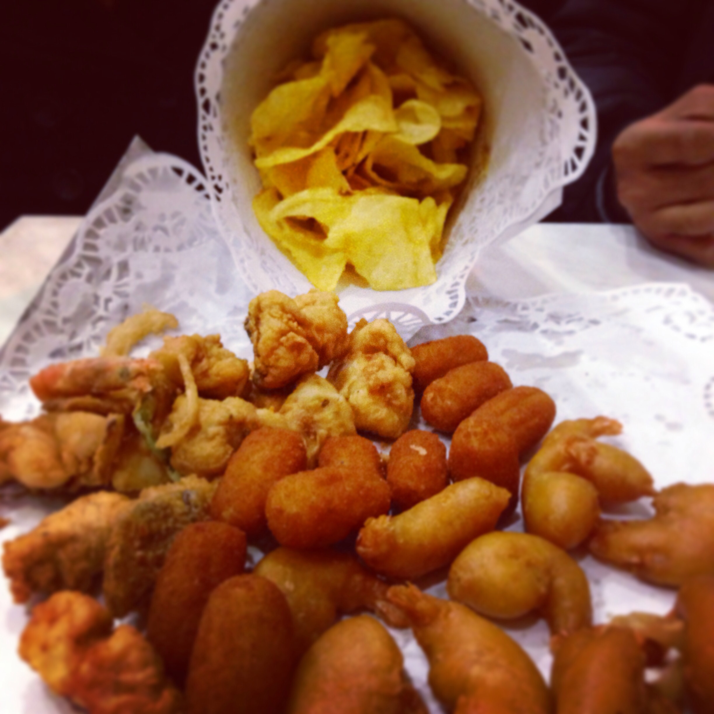 On our first night, we decided to eat the typical ‘pescadito frito’, which is, quite simply, fried fish. We had been recommended La Isla, which is a small, crowded, fast-food-style place (a so-called ‘freiduria’). Fish is served by weight, and so we ordered a mixture of species, including the more standard prawns and squid. Our order arrived in paper folded into a cone with no spices or sauces, but potato chips on the side. The fish was good, but a little too greasy for my liking. It is the typical cuisine though, so we were glad we tried it, but we had it again in Granada at Bar Kiki, where it was much better!