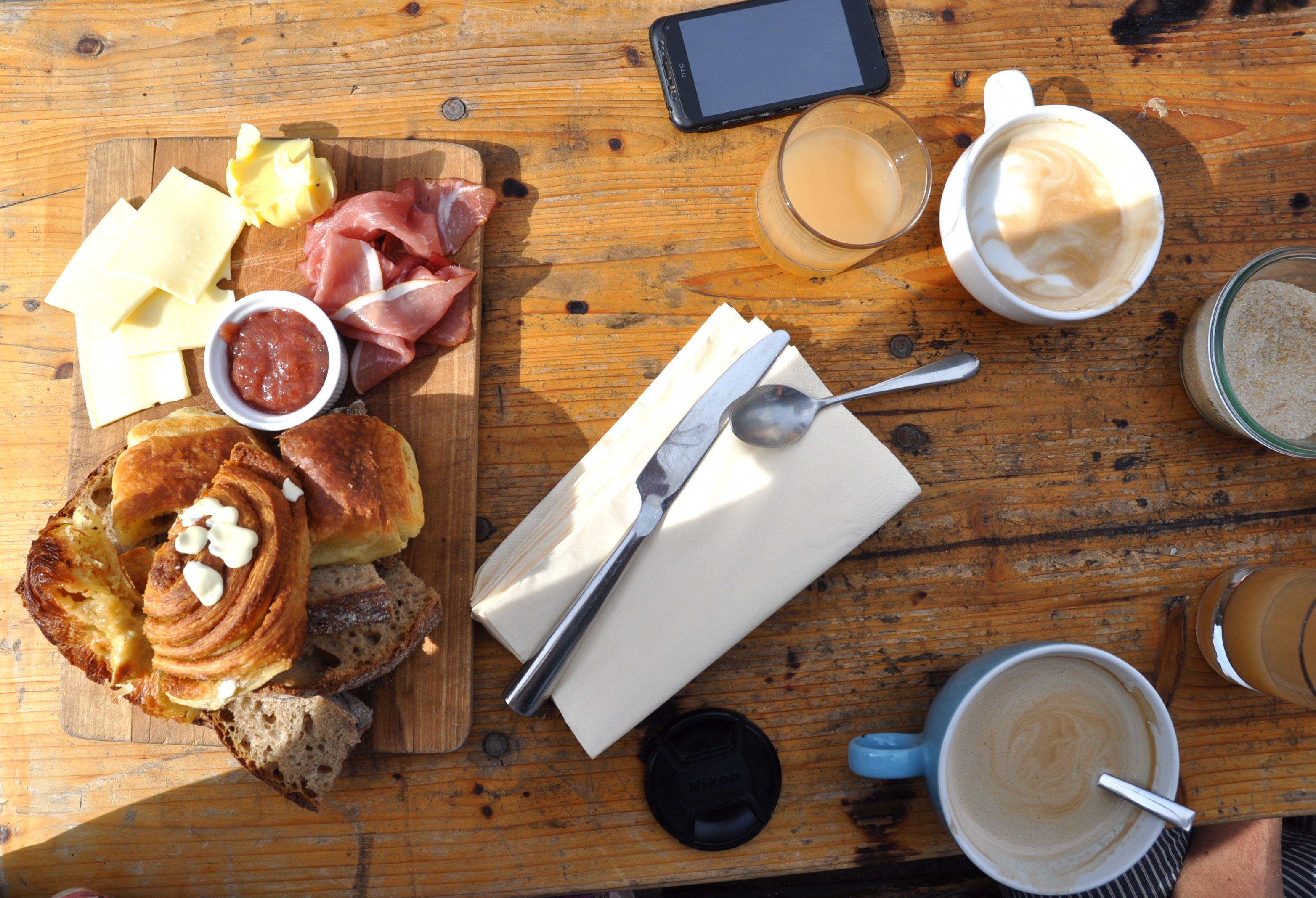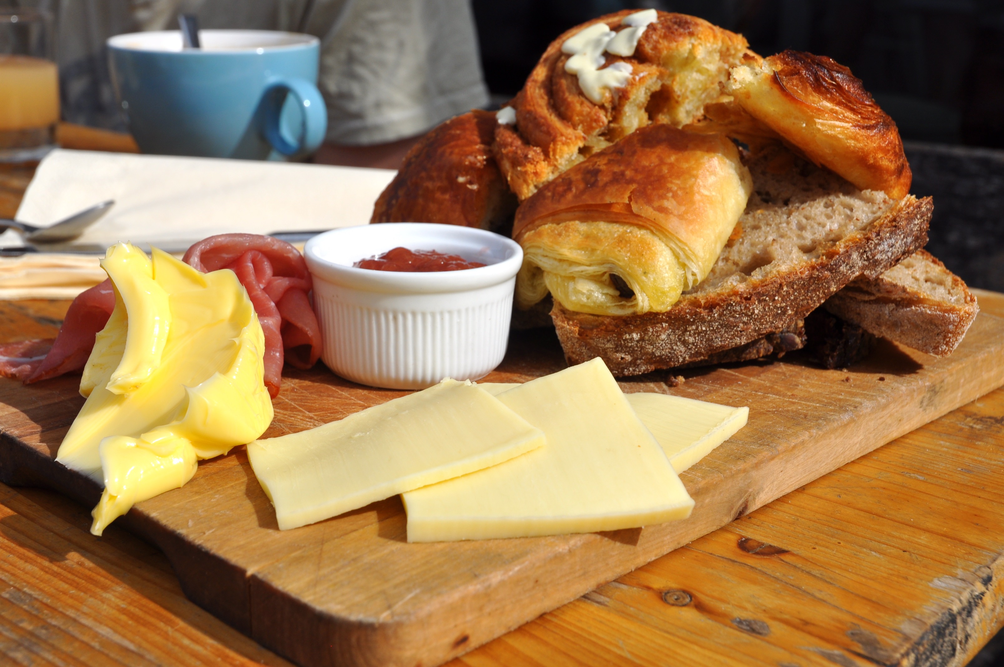 When the food arrived, my eyes grew to the size of dinner plates. Assorted breads, meats and cheeses, butter and jam, fresh apple juice and coffee looked at me and begged to be eaten and drunk. Everything was beautifully arranged on wooden boards and that smell, again, assaulted my senses. I barely waited for the decorous “Bon Appetit” before tearing into everything greedily.