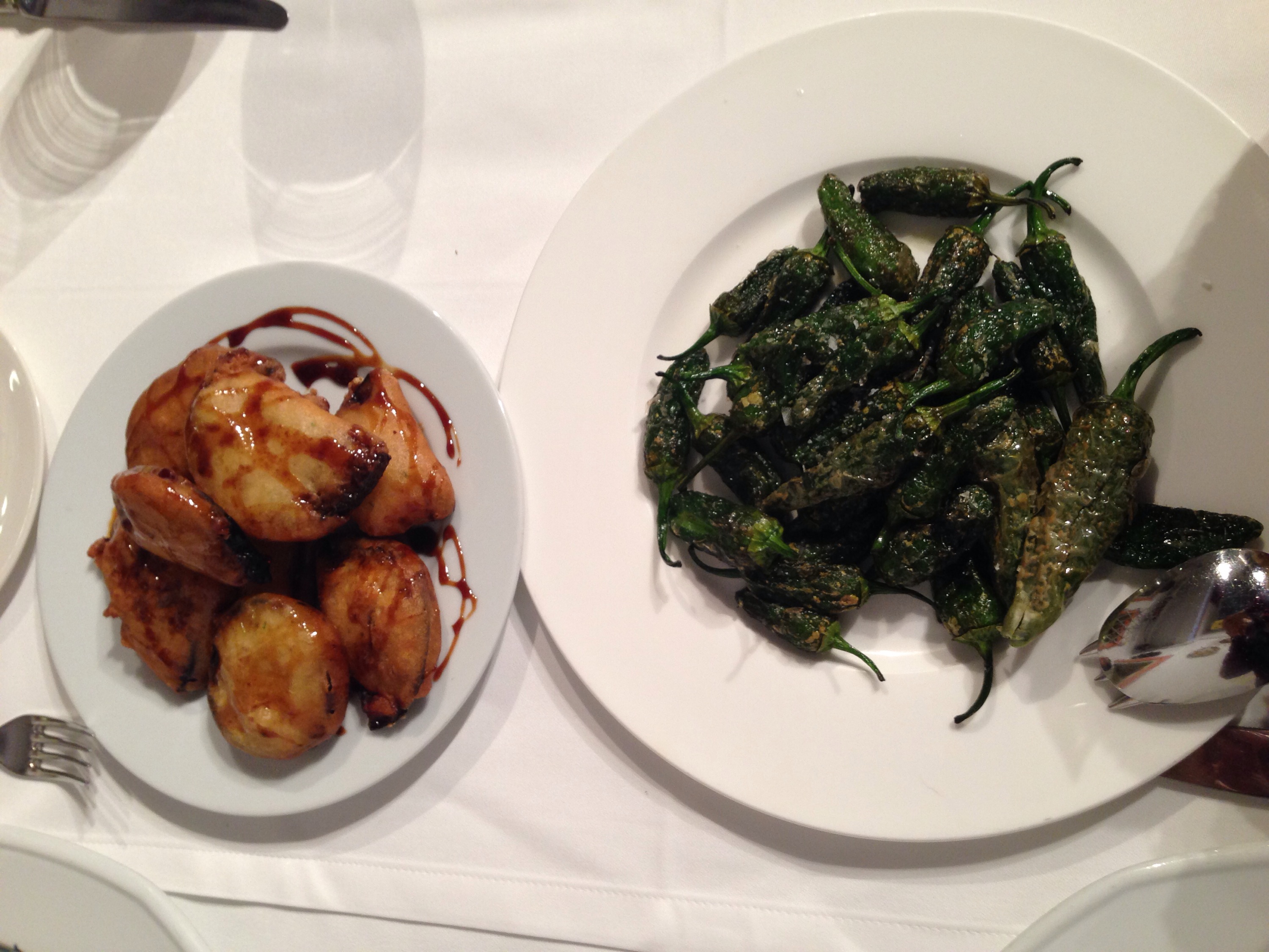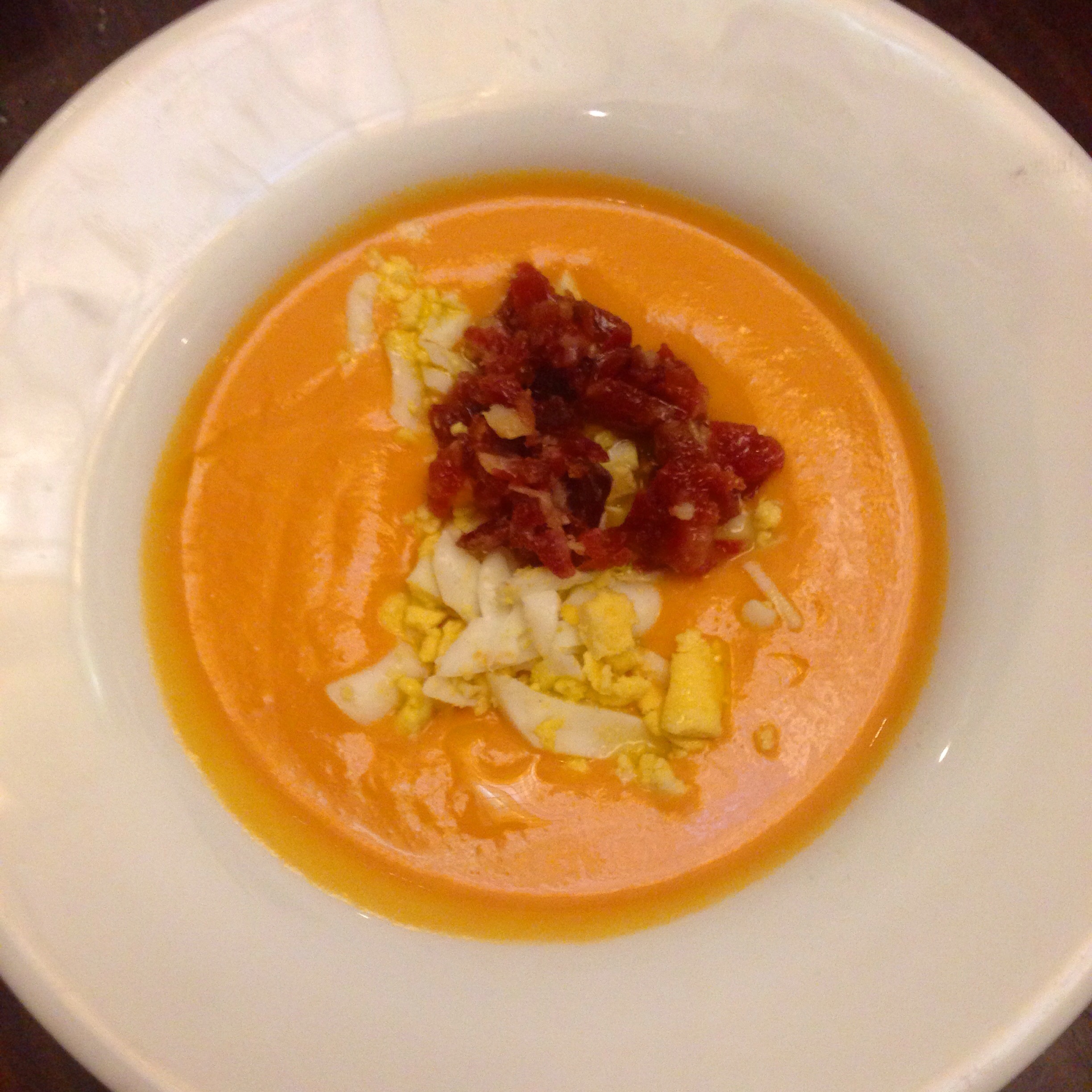 Now, to the food. The highlight of the evening (for me, at least), was the salmorejo. My sister had told us about this beforehand, and that we needed to try it, as it is typical of the region. It is comparable to gazpacho, but not really… it’s a cold tomato soup (although Felix refused to refer to it as such, preferring to call it a ‘cream’), blended with bread and garnished with bits of hard-boiled egg and jamón. Why was it the highlight?