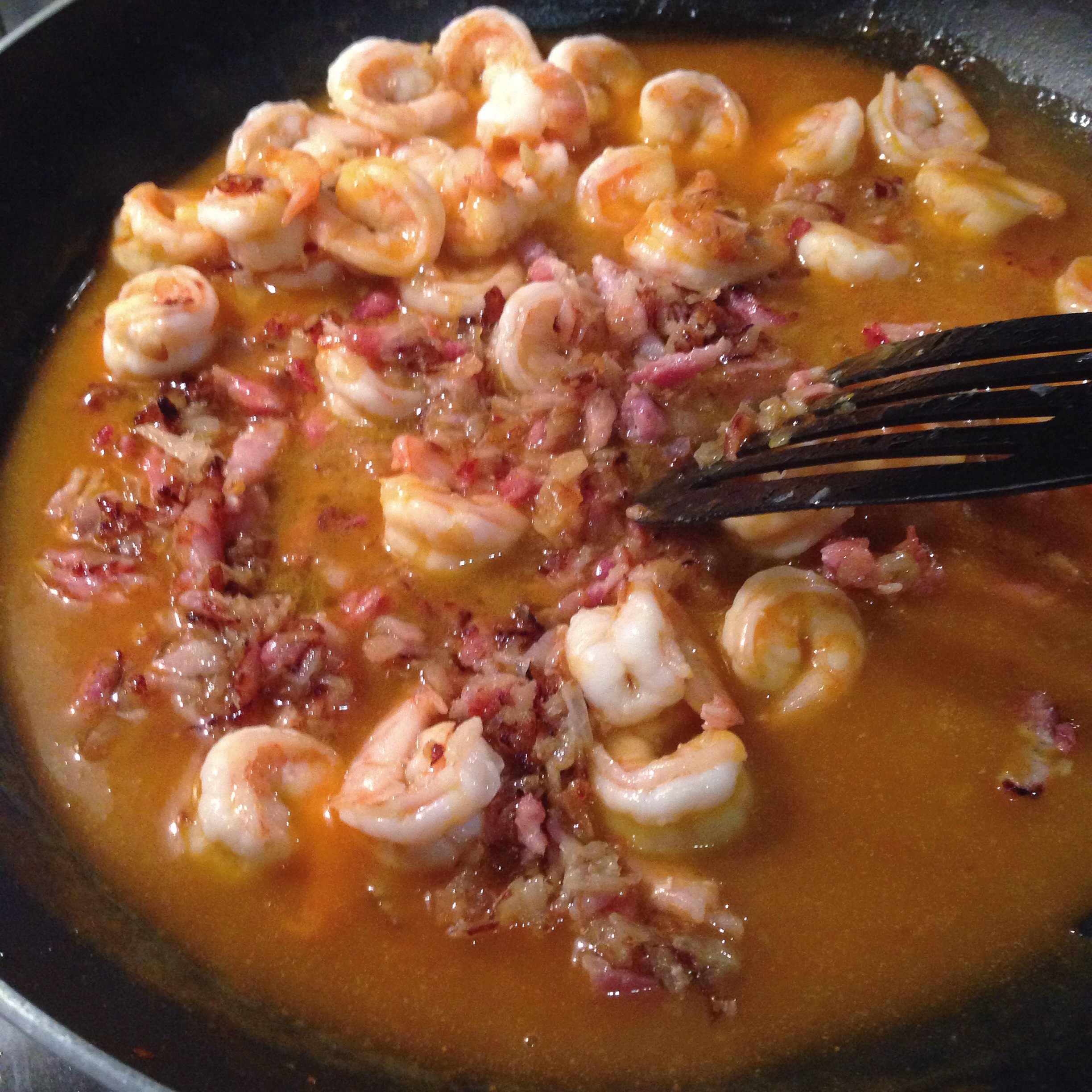 Add the shrimp and bacon-shallot mixture back into the pan and let it heat back up to cook the shrimp through.