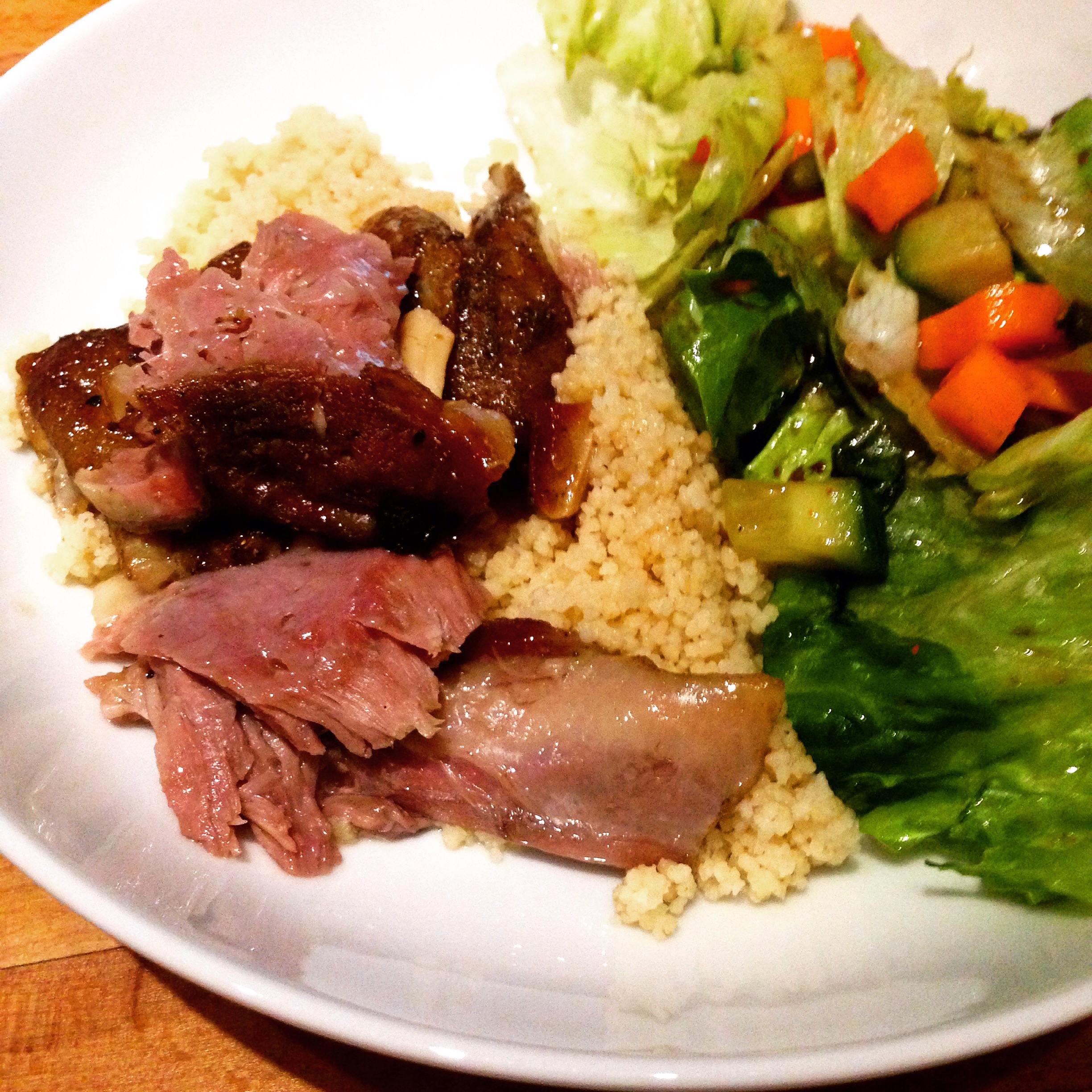 Serve with couscous and a simple green salad (I added cucumber and carrot), or alternatively you could make some roast potatoes or vegetables. As the meat is very rich, I enjoyed the lighter sides. Don’t forget to drizzle some of the lamb juices on top of your couscous!