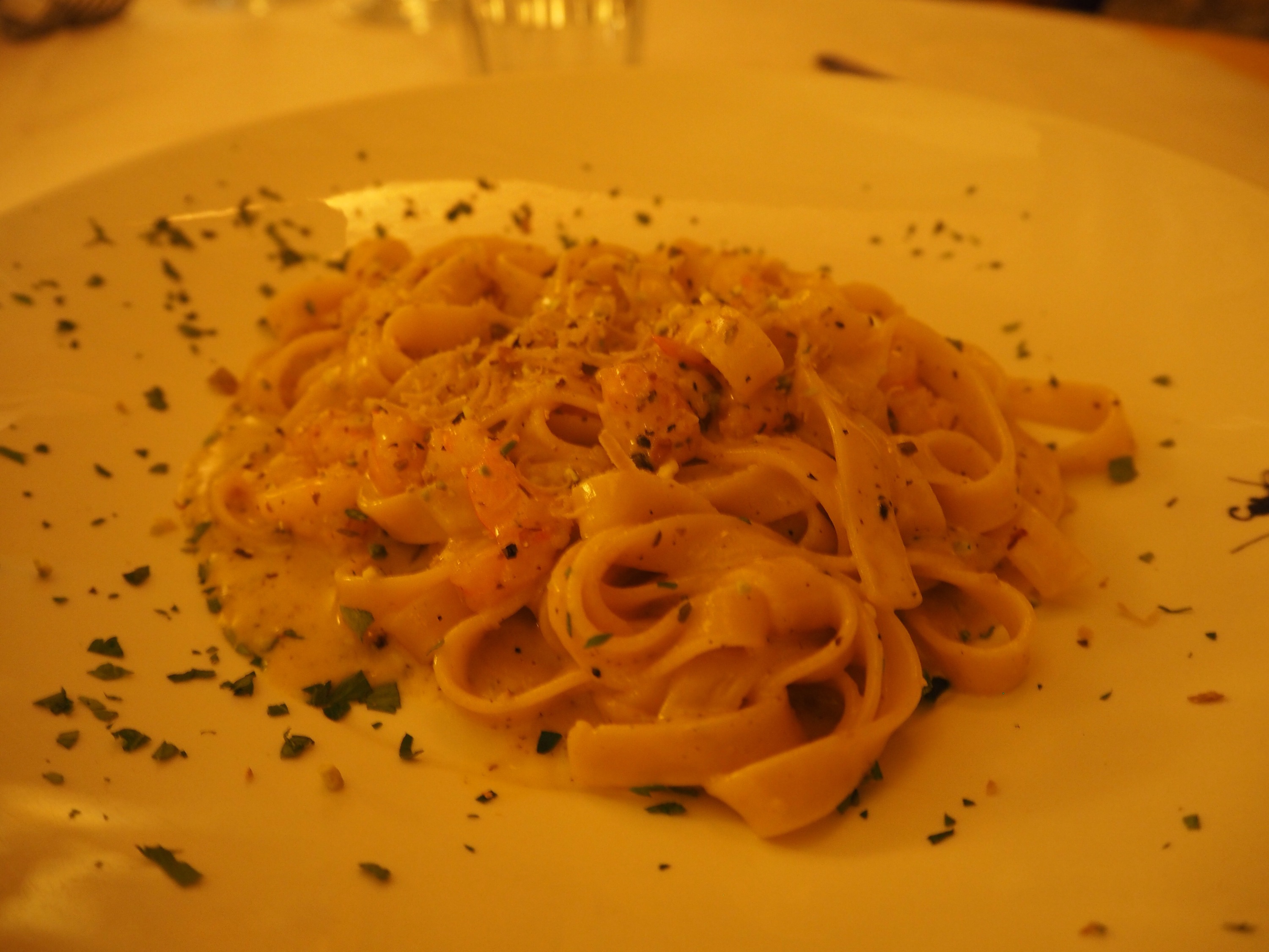 The menu was quite small at this family-run taverna, particularly compared to a lot of the touristy places we had come across, and it boasted pasta, meat and fish, but no pizza. Despite the late hour, it was still bustling, and when we asked for a table we were rudely informed us that without a reservation, nothing would be possible, especially not for five people! We were slightly disheartened, but luckily, another waiter came along and assured us it wouldn’t be more than a ten minute wait. Lo and behold, ten minutes later we were sitting at a cosy table, and luckily, it was the second waiter looked after us for the rest of the evening.