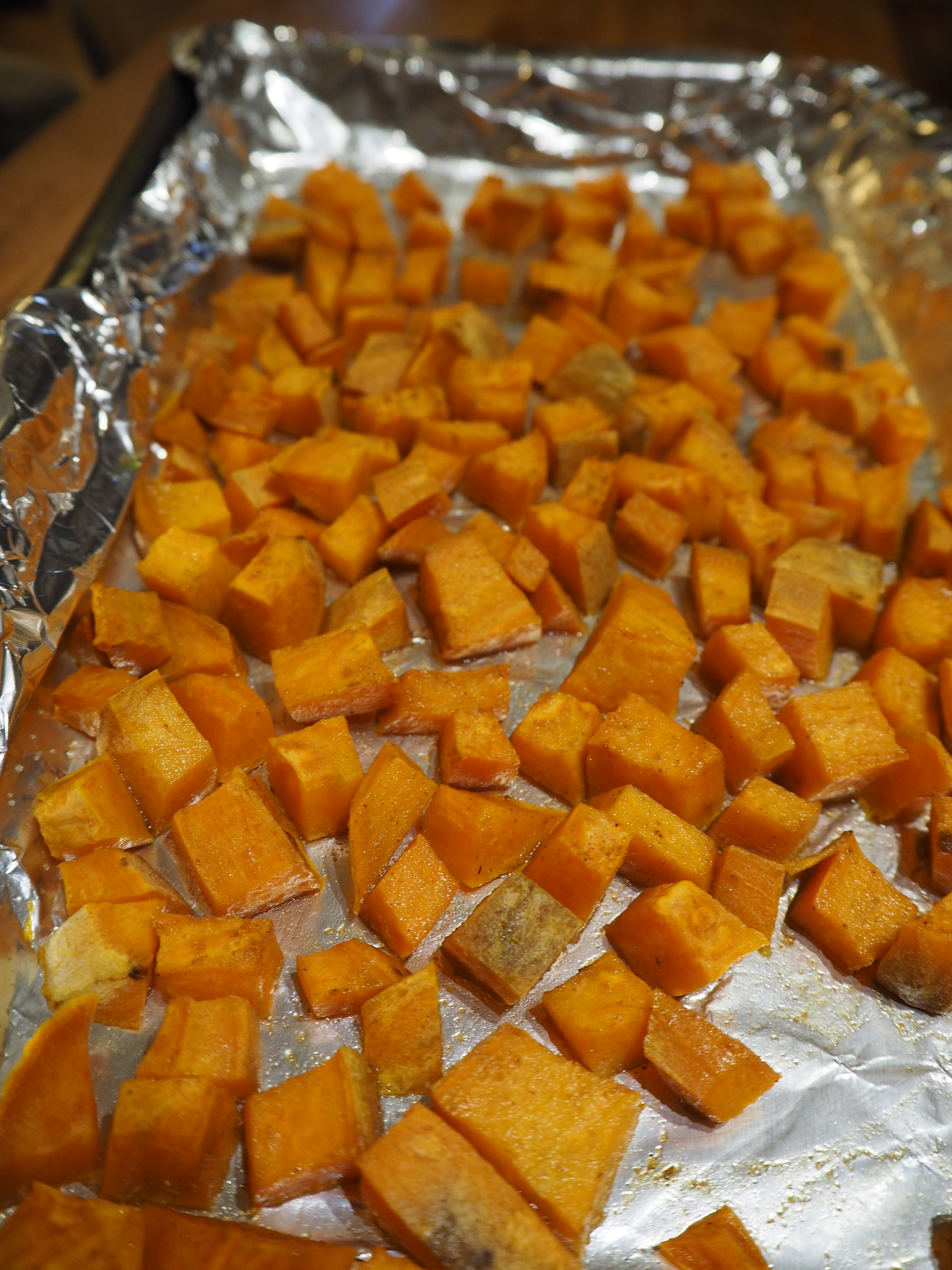 Pre-heat the oven to 200 degrees Celsius. Line a small baking tray with tin foil and mix up the sweet potato pieces with the olive oil, cumin, coriander and salt. Roast until soft (this should take about 30 minutes).