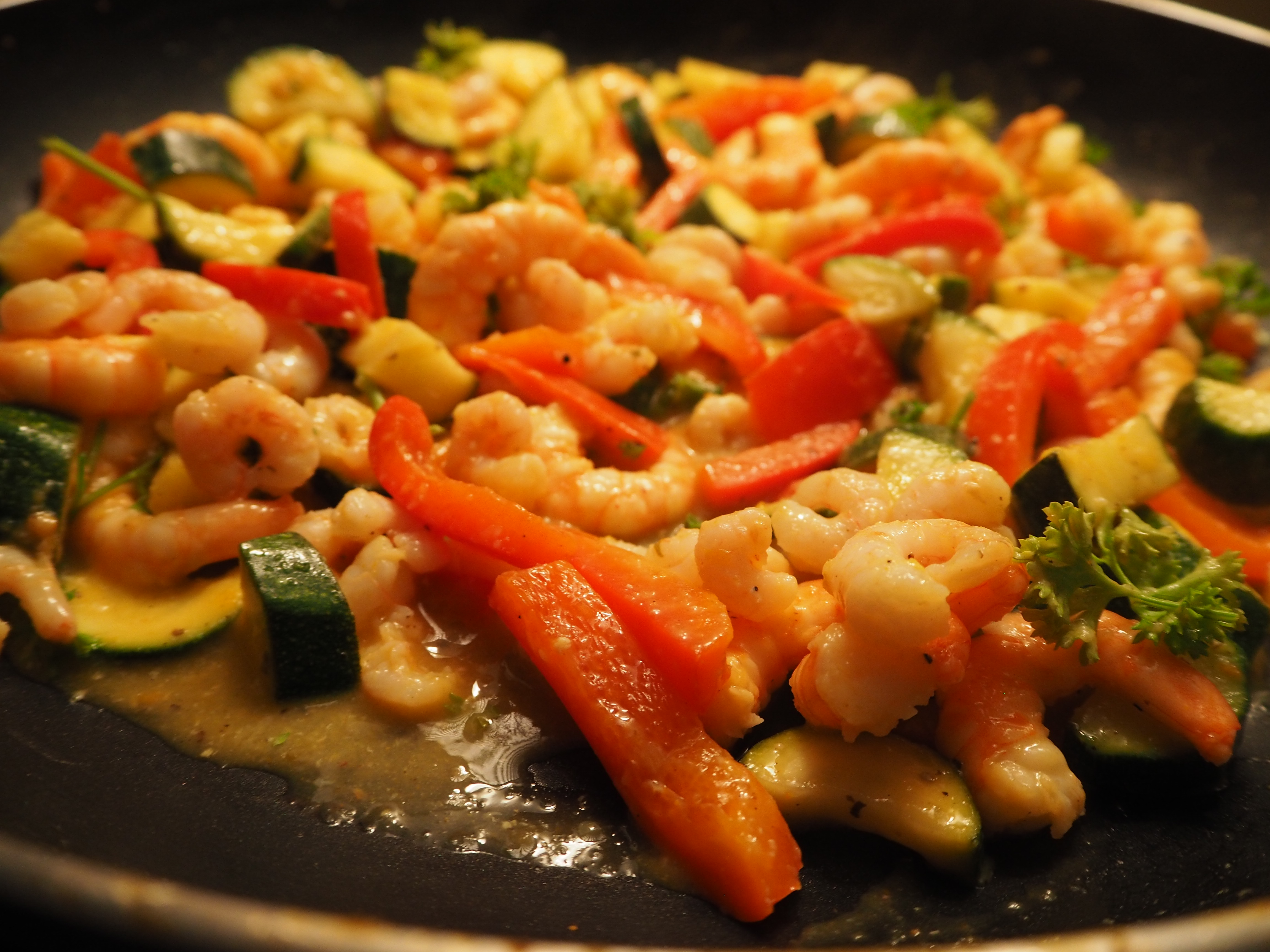 Heat the olive oil in a large frying pan and add the minced garlic. After 1 minute, add the zucchini and pepper. Fry for a few minutes, and then add the Encona Peruvian Amarillo chilli sauce. Stir until the vegetables are coated and then add the prawns and fresh parsley. As soon as the prawns turn pink, turn off the heat and serve with some black pepper on top and quinoa on the side!
