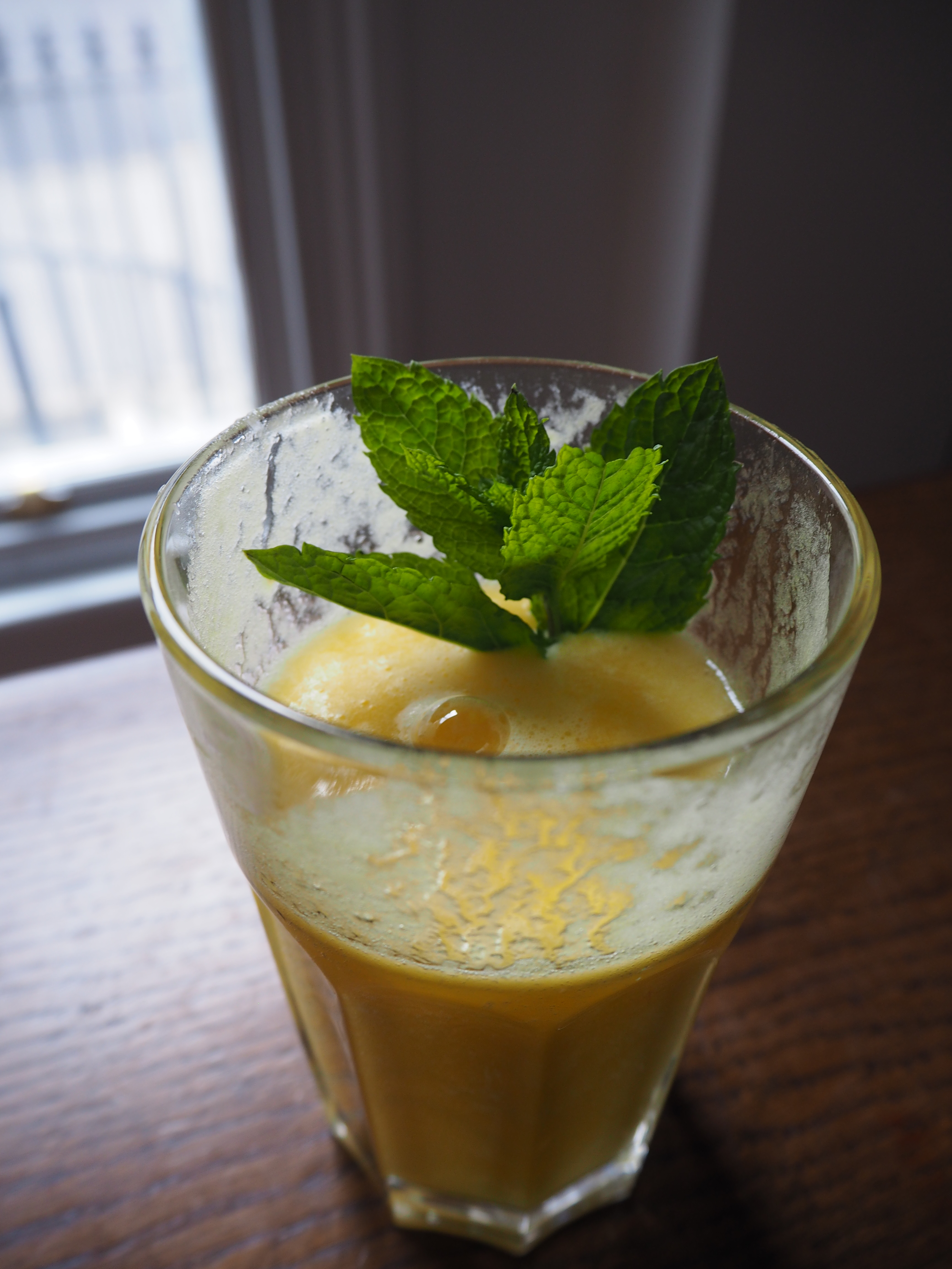 Pineapple-mango-ginger juice, garnished with fresh mint