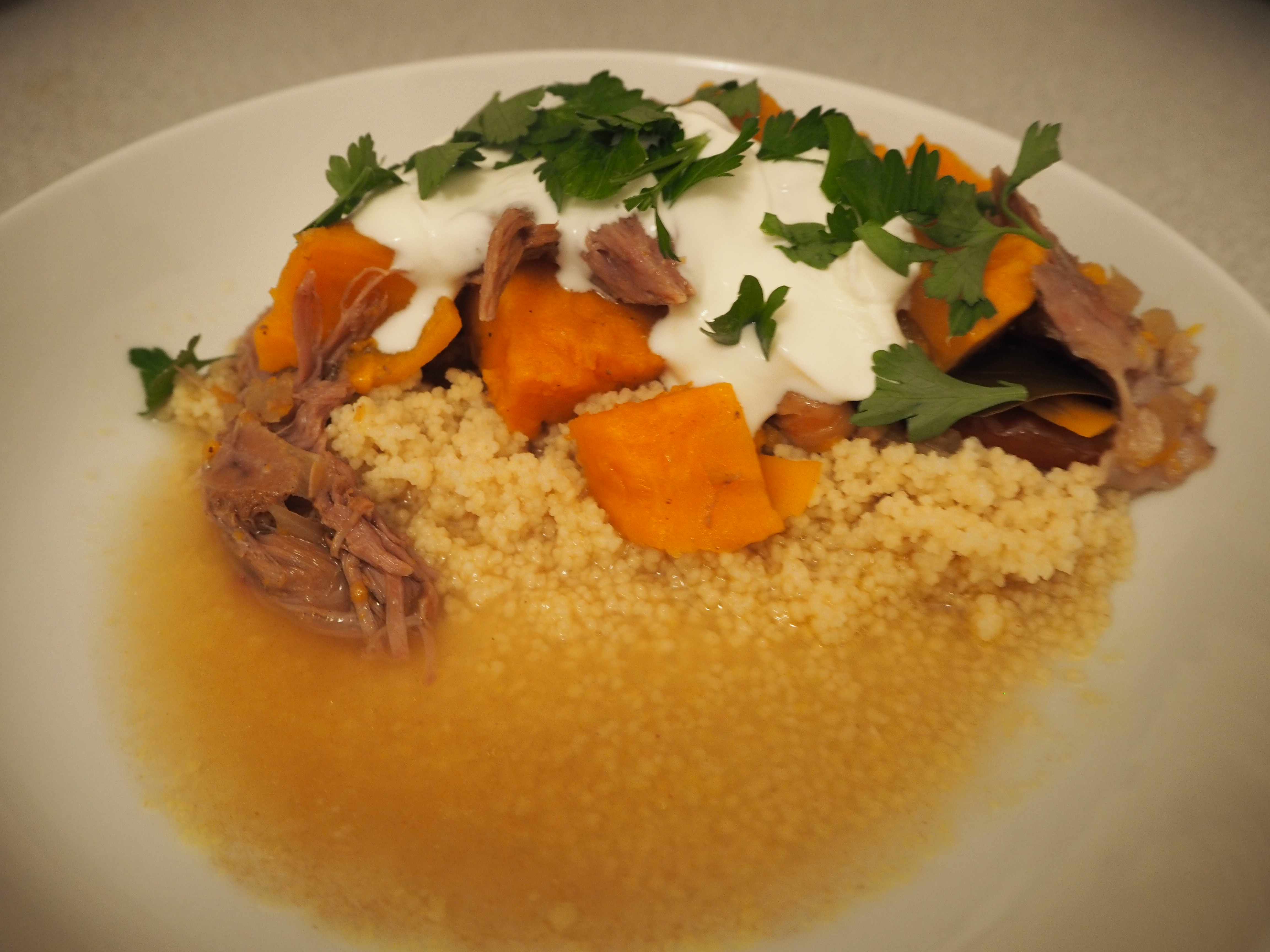 After you’ve placed your piece of meat in the slow cooker, simply add everything else on top. Stir a bit, and then cook on low heat for 8 hours. Serve on a bed of couscous, garnish with yogurt and a smattering of fresh herbs on top, and feel truly warmed from the inside out!