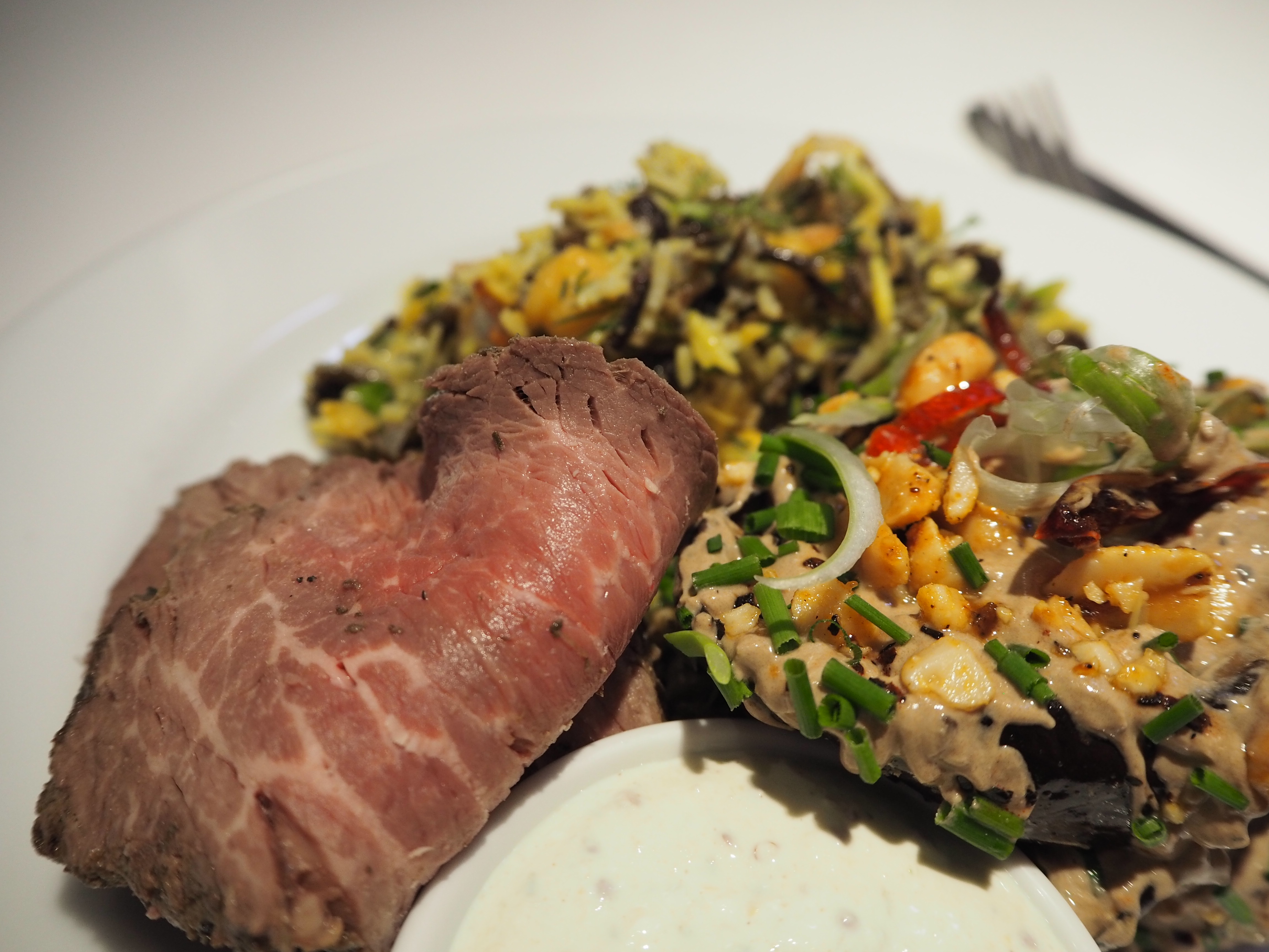 Main: roast beef with horseradish sauce. Salads: Saffron rice with crispy onions, plus aubergine with black garlic and crunchy peanuts