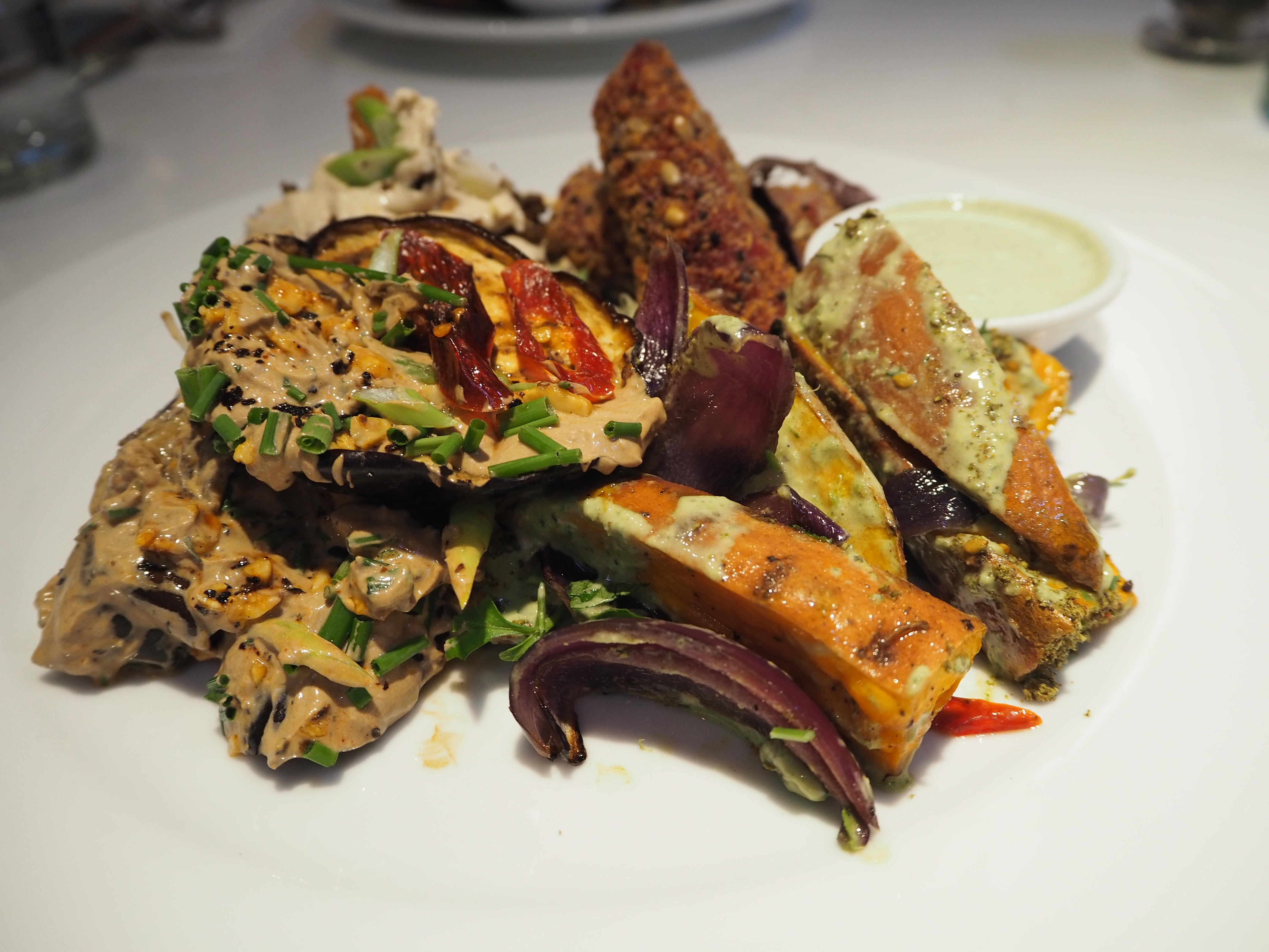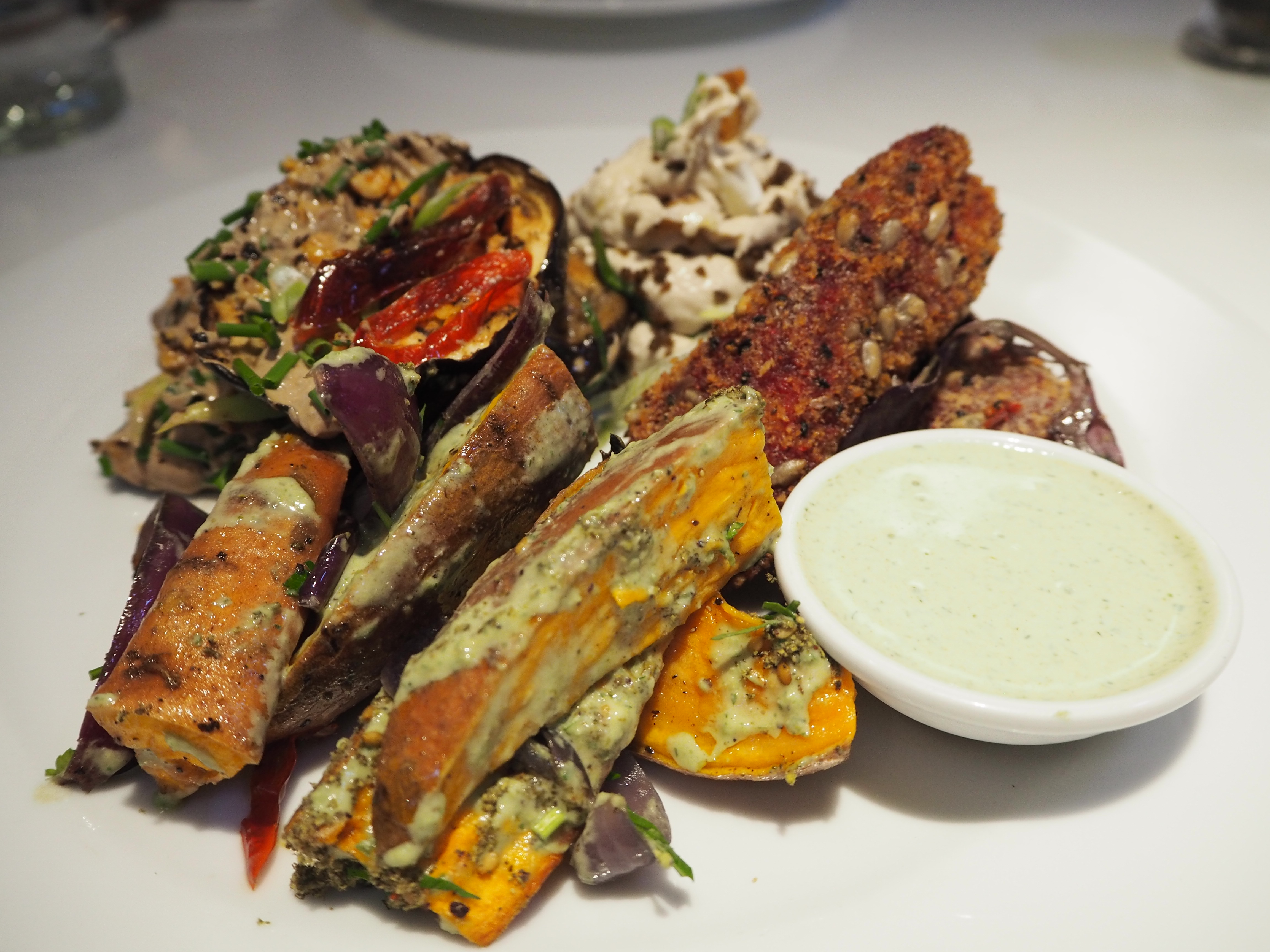 My friend got the aubergine as well, but paired with feta and betroot fritters, plus sweet potato chunks and broad bean hummus.