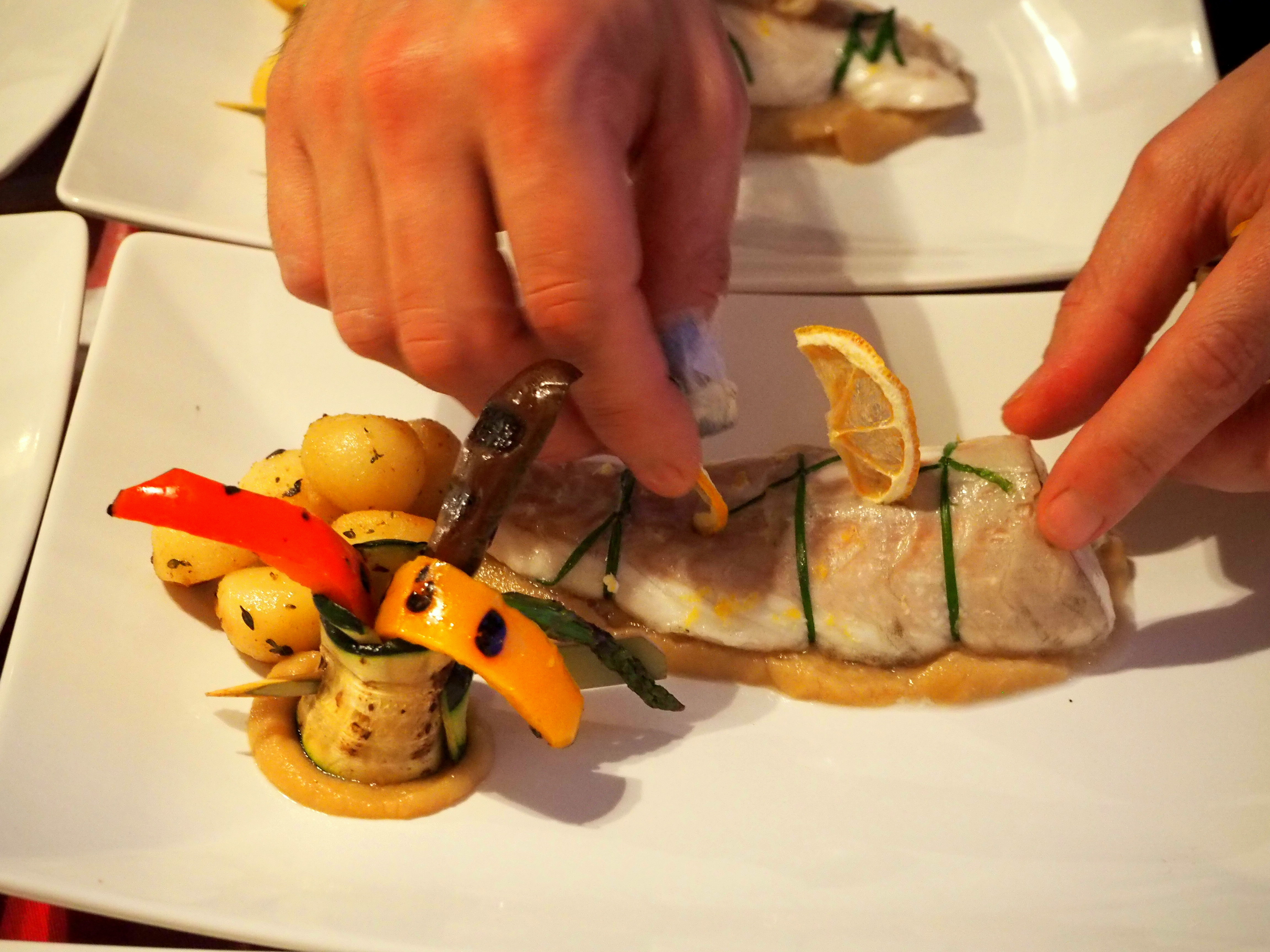 The first course was scallops with almonds, bread crumbs, and hummus. The delicate scallops were deep-fried and served on a skewer, and the hummus was plated up in a little swirl. I felt there was a bit too much hummus, as I wanted to savour the scallops more, but it was nonetheless a very strong start to the evening.