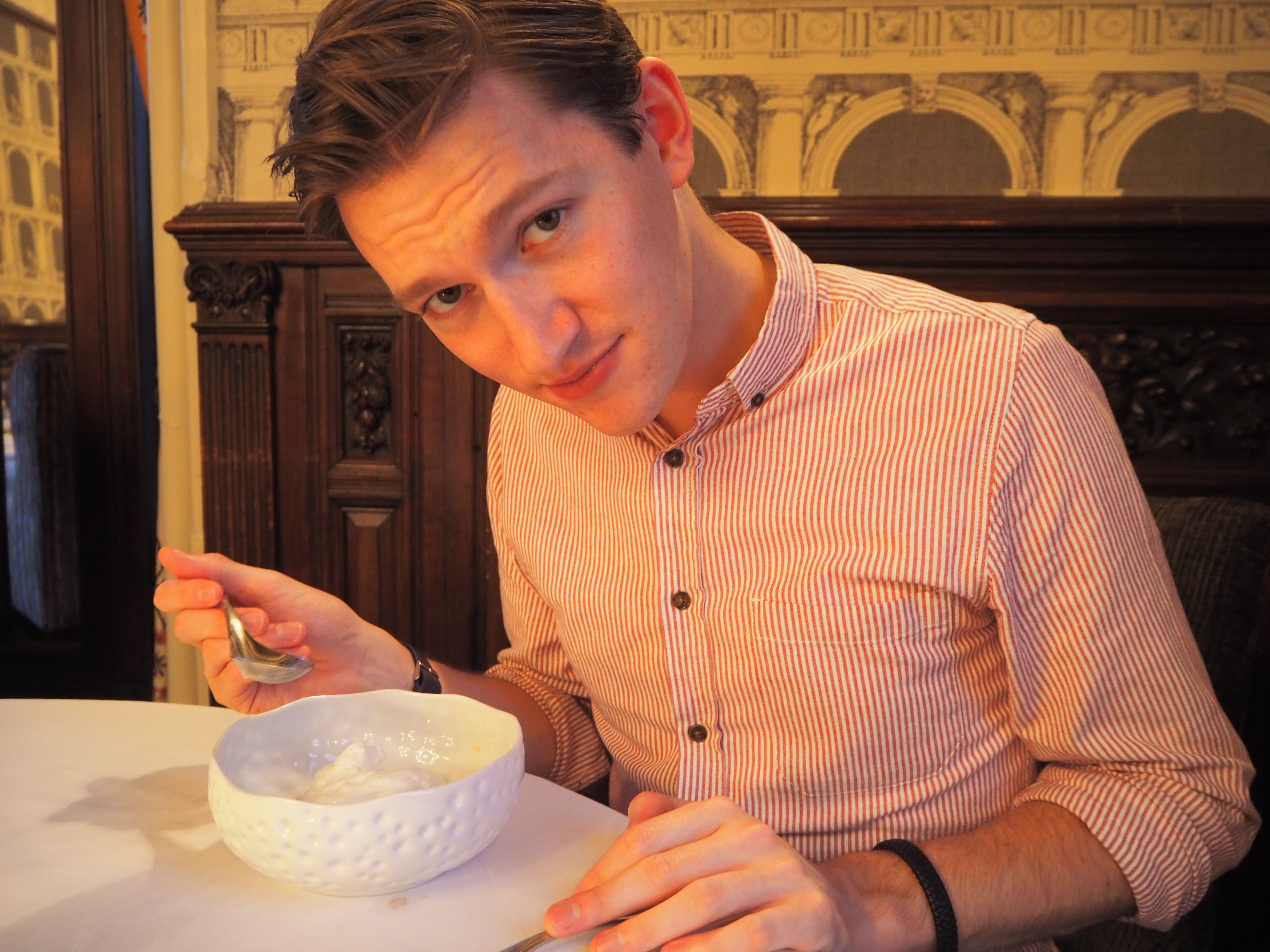 The dining hall was just as gorgeous as last year, with the mother-of-pearl ceiling and beautiful chandeliers providing the perfect backdrop to the stunning food. The service was absolutely flawless, and we really appreciated our waitress’ advice that we shouldn’t order any drinks to start, as we had ‘a lot to get through!’ After the champagne, she also gently suggested that we could go down a size on the wine pairings, which we scoffed at to begin with. Looking back on it, going down to 75ml from 125ml may have saved us falling up the stairs on our way back to the room!