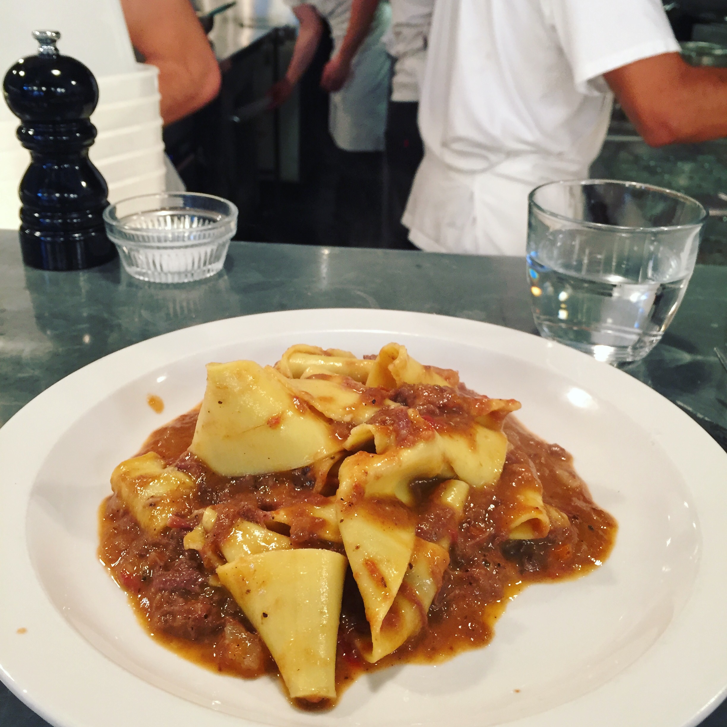 I love pasta. But mainly, I love good pasta, which is astonishingly difficult to get in London. My previous favourite in London was Anima e Cuore, but it has now been surpassed by the amazingness that is Padella! I arrived at 11.55 on Monday and there were around 20 people queuing in front of me – luckily, as they have a downstairs area too, I got in with the first wave and was seated without delay. I was immediately struck by the briskness and perfection in the kitchen process, and couldn’t take my eyes off all the chefs. Every single portion of pasta is made to order, and at any given moment there were 10 individual pots simmering away. ‘How do you keep track of all them?!’ I asked in wonder. ‘With difficulty!’ the chef responded with a smile. He could tell if the pasta was done with just a glance (and sometimes a squeeze), swiftly draining off the water if so. After all, one minute here or there can be the difference between al dente and overcooked.