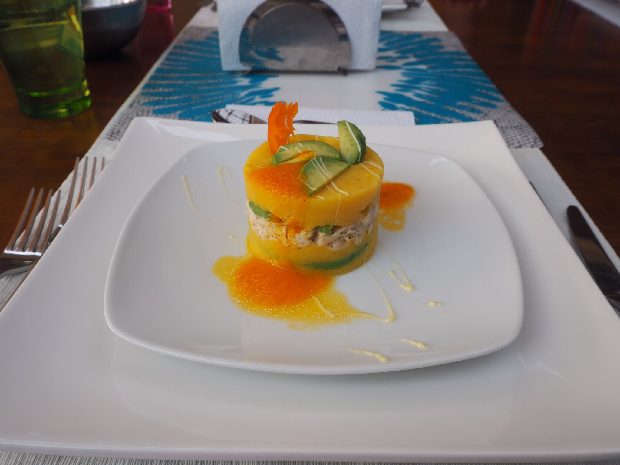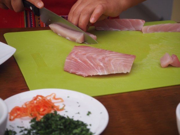 Starting off with the causa, we made a very different kind of mashed potato than what I’m used to. With just a bit of oil and chilli sauce made of the ever present aji amarillo, it was combined with avocado and chicken mayonnaise to form a tower. I liked the look of it and the flavours, but it was a bit too stodgy for my liking due to the amount of potato. I’m sure it would be extremely comforting if I were going off to war, though!