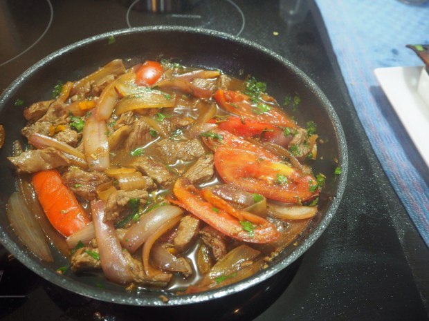 As mentioned, Diana was very good at explaining the history of Peruvian cuisine, especially the Chinese influence, which I was unaware off. Apparently, about 10,000 Chinese men came to Peru after slavery was outlawed, and so they mixed and mingled with the Peruvians, as well as introducing various aspects of their cuisine. So when you see a restaurant with Chifa written on it (we saw so many of these), that means Chinese cuisine with Peruvian ingredients! With this in mind, we made our main course, the lomo saltado, which was a variation on a stir-fry, with a few twists coming from Spanish and Italian influences too. As with most Peruvian and Bolivian main dishes, we had two types of carbs to go with it: rice and potatoes!