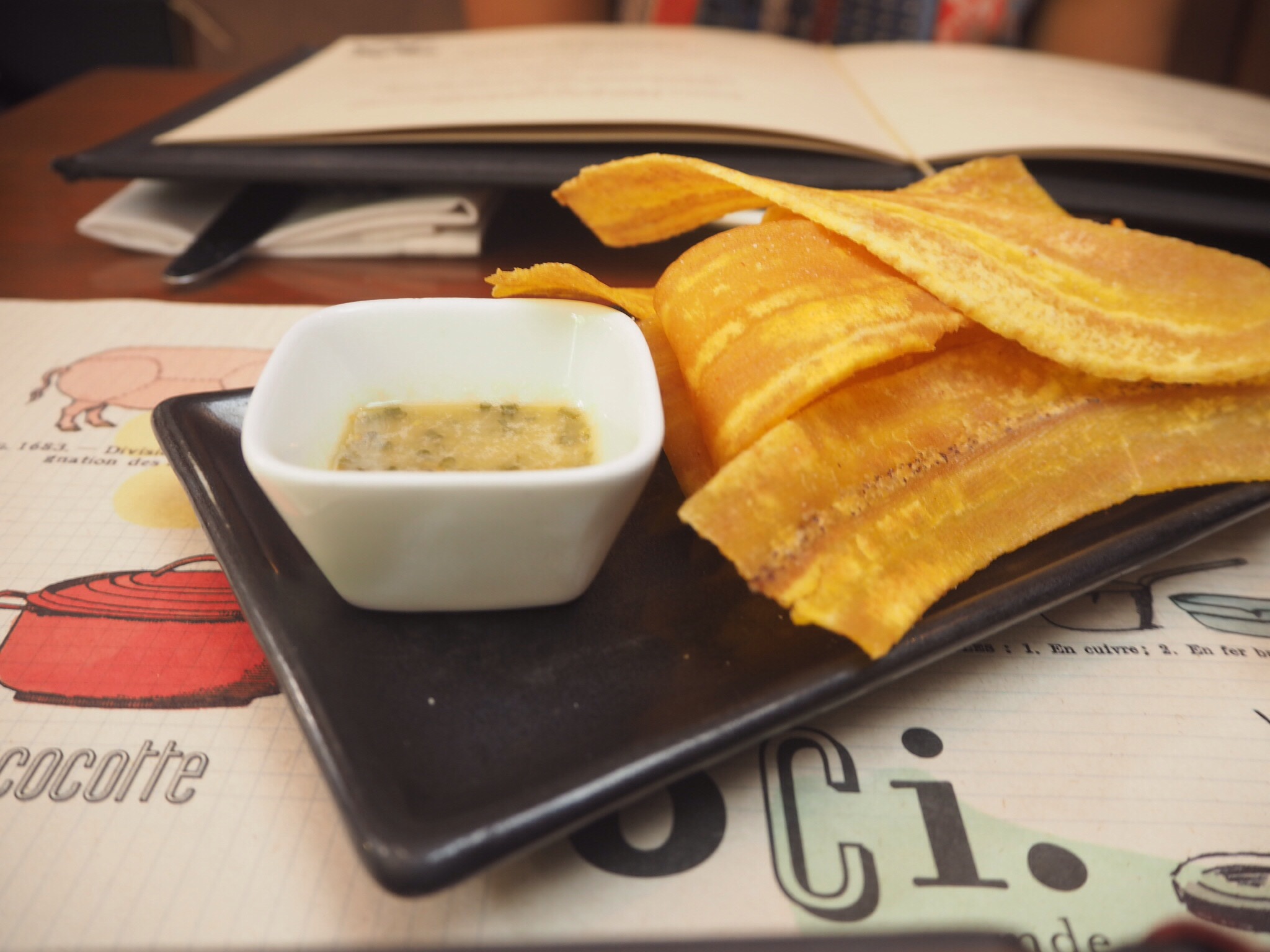 Starting off with a beautiful lychee cocktail, which was summery and fresh and one of the nicest cocktails we’ve had on this trip, we knew we were in for a treat. It was accompanied by the ubiquitous plantain chips we’ve grown so fond of in Ecuador and Colombia, and served with a vinaigrette which I loved, but was slightly too acidic for my companion.