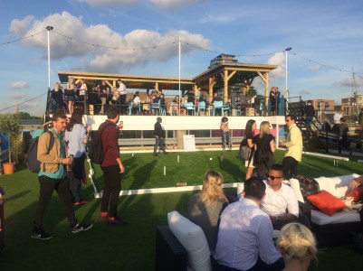 Last week, Kiran offered me the chance to head East into the unknown. My friend and I braved the DLR to head to Skylight, a newly opened bar on the roof of a carpark in deepest darkest Wapping. It pitches itself as ‘British Urban Lawn Club’. Think acid-green astroturf as far as the eye can see, croquet lawns and petanque; garden furniture fresh from the pages of those catalogues that fall out of newspapers . My friend and I were lucky enough to go on one of the first genuinely stunning early summer days of the year – blue skies, warm air, a slightly giddy ‘this-is-all-too-perfect-when-will-it-rain?’ feeling. The set-up was promising.