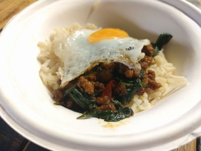 By the time we got to the front, all of time had passed and we no longer knew our own names. We were informed that they too had sold out of everything except for KraPOW’s Krapow: a thai street food dish featuring stir-fried pork mince served over jasmine rice and topped with a fried egg.
