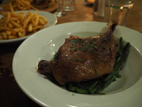 With our stomachs sufficiently warmed up, it was time for the mains. I chose the confit de canard, as I never pass up a chance to partake of this fine animal, and I did not regret my choice. The meat simply fell off the bone, and the beans were perfectly tender (although I was not a big fan of the mint flavour). I was also very happy with my decision to order frites on the side, as they were as slender and crispy as a sunburnt supermodel.