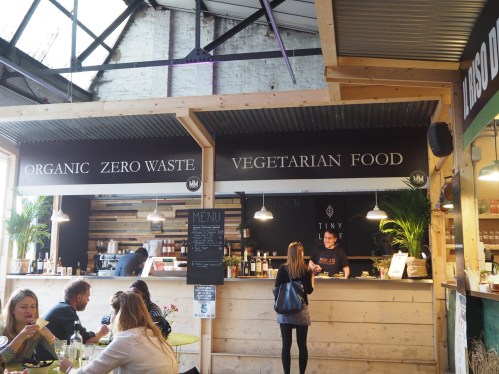 There’s not a plastic plate in sight as food is served on wooden boards, real crockery, or paper plates. There are also a number of recycling points throughout the place, which is far bigger than it seems upon first entrance. Tempted by the sights and smells of pizza, build-your-own tiramisu, and various wine bars, we made our way to the back of the market and Tiny Leaf.
