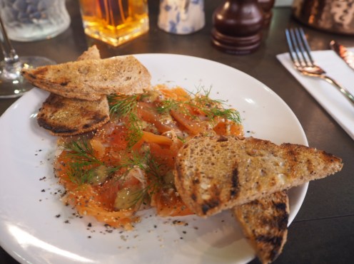 As I’m not eating meat this month, I focused on the fish, and started off with the gin smoked salmon. It arrived in generous slices, with just the right amount of mustard on top, smatterings of fresh dill, and crispy toast. What a refreshing change from the terrible salmon I had at Four to Eight recently…!