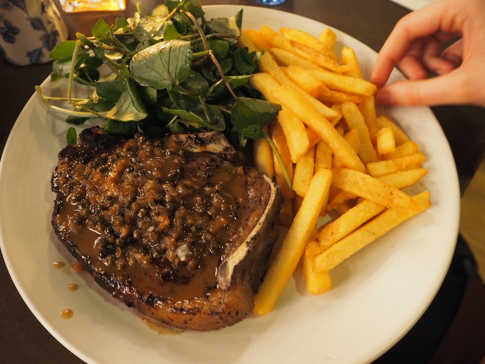 I can’t vouch for the steak, but my friend devoured it, praised its juiciness, flavour, and peppercorn sauce, and also proclaimed her affinity for the gloriously crispy chips!
