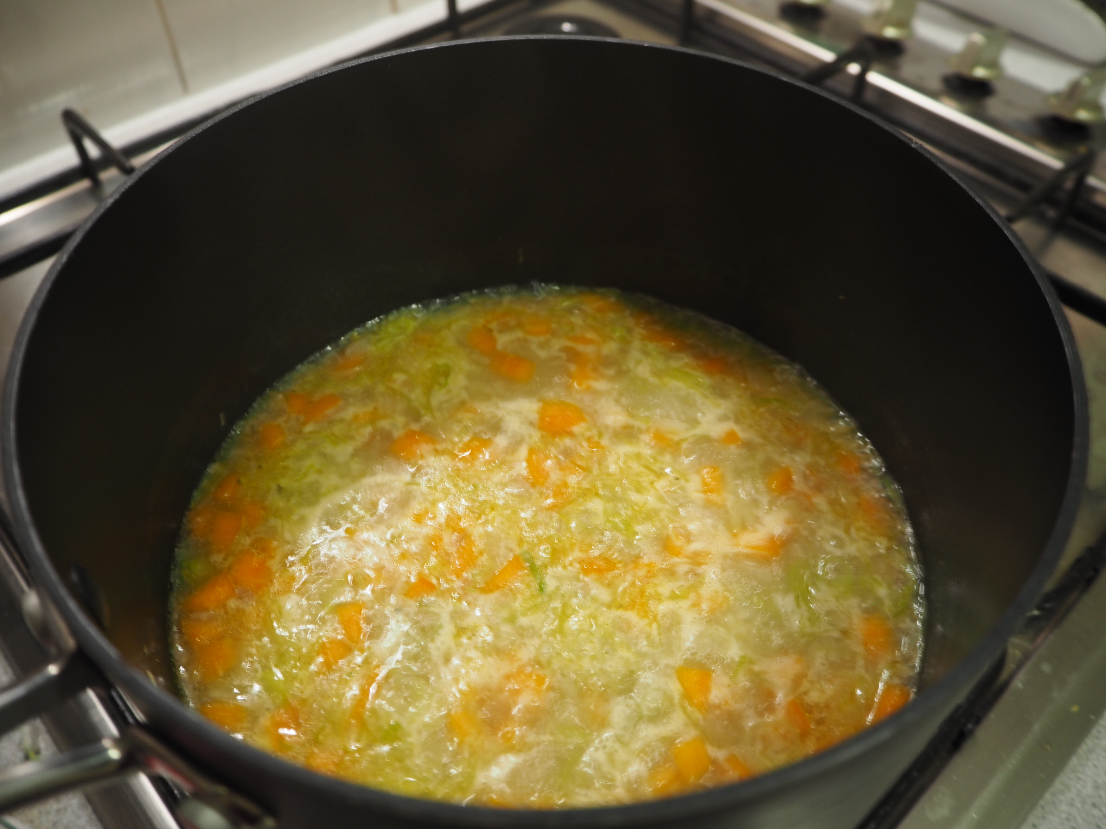 Melt the butter in a saucepan and sweat the onion, leek, and carrot on medium heat for around five minutes. In a separate jug or bowl, mix the stock with the flour, and then add to the saucepan. Cover and let simmer for around 20 minutes.