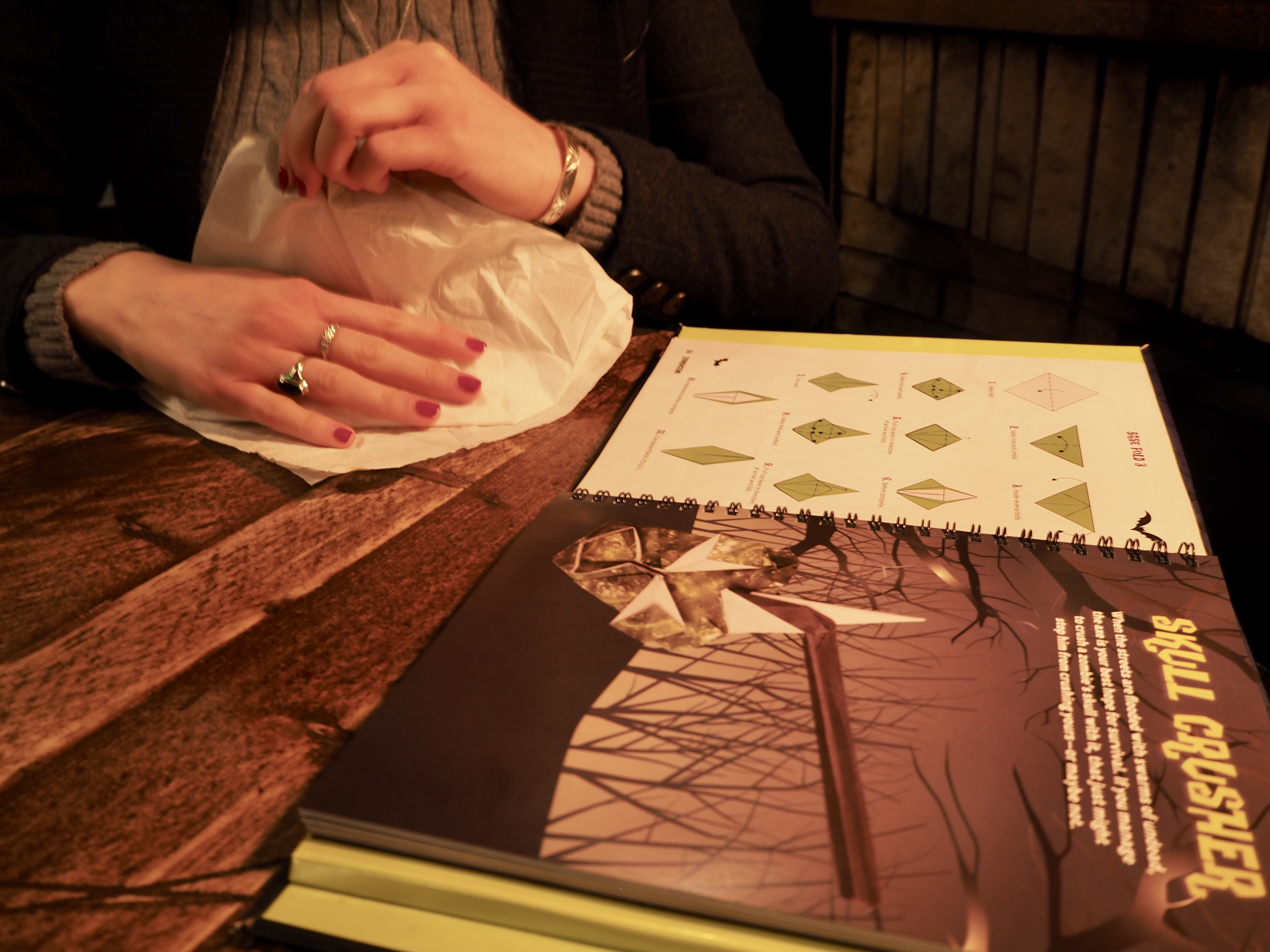 Throughout the evening, I felt very well taken care of, which isn’t a common occurrence in a pub, as you’re usually left to your own devices, venturing to the bar only when you really need something. The manager at Harringay Arms was very friendly and hugely knowledgeable about their craft beers, suggesting which ones would go best with our food, and even proactively coming back before the mains to change my friend’s order, as he felt that the previously recommended stout would have been too heavy with her choice of meat pizza. He was right, and he earned bonus points for recommending the best beer name ever – Gigglemug! On an unrelated note, we also made/tried to make some zombie origami later on…