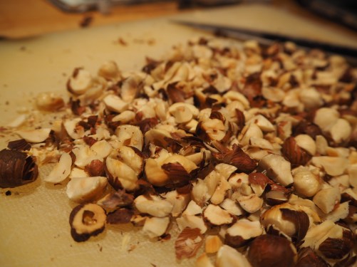 - 150g hazelnuts, roasted and roughly chopped (I dry roasted them for 5-10 minutes in a frying pan)